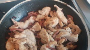 Cortamos las pechugas de pollo y el bacon en tiras o cuadraditos pequeños (si no venían ya así). Ponemos una sartén al fuego sin aceite ni nada y la calentamos a fuego fuerte. Ponemos el bacon y dejamos que se cocine hasta que quede churruscadito, bajando el fuego si lo consideráis necesario.