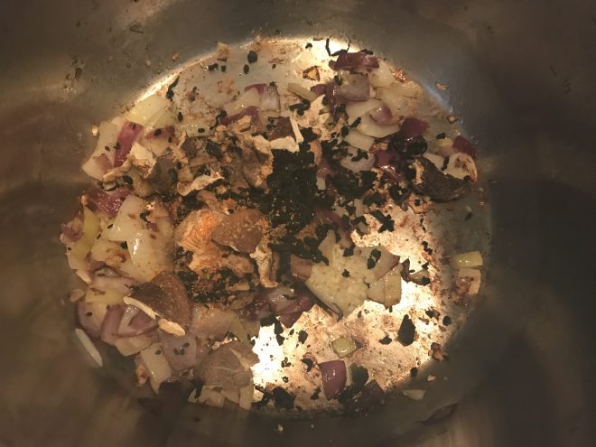 Incorporamos las setas (si son frescas, lavadas y troceadas), las algas, las especias y la sal y removemos bien 2 minutos.