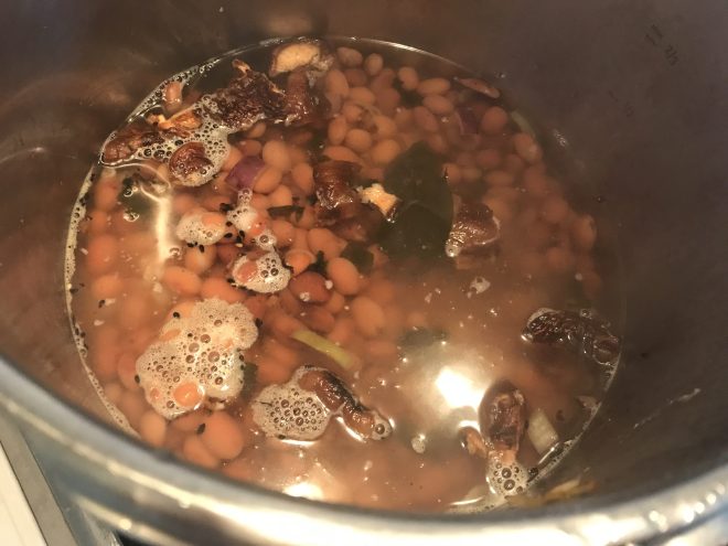 Agregamos las alubias (rehidratadas o bien enjuagadas si eran en conserva) y cubrimos con agua unos 5 dedos.