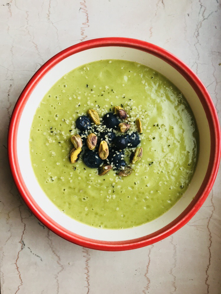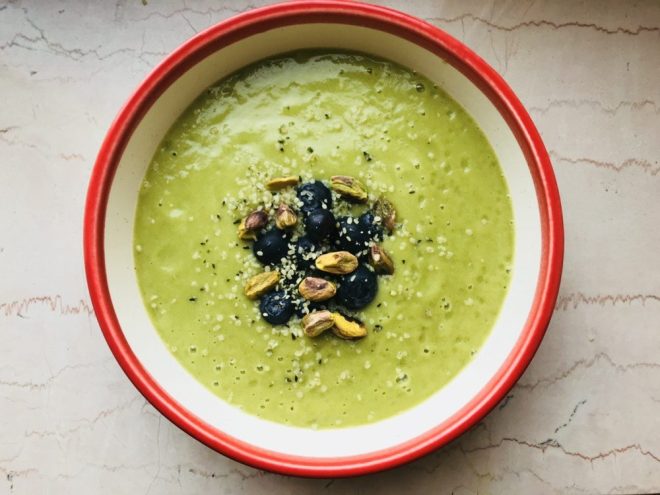 Trituramos todo muy bien (en thermomix, 1 minuto a velocidad 10) y servimos tal cual o con cositas por encima (en mi paso, pistachos y semillas de cáñamo).