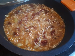 Removemos bien para que se empape el arroz y se nacare. Si lo veis muy seco, poned un chorro más de aceite y removed. Lo dejamos así 4 minutillos.