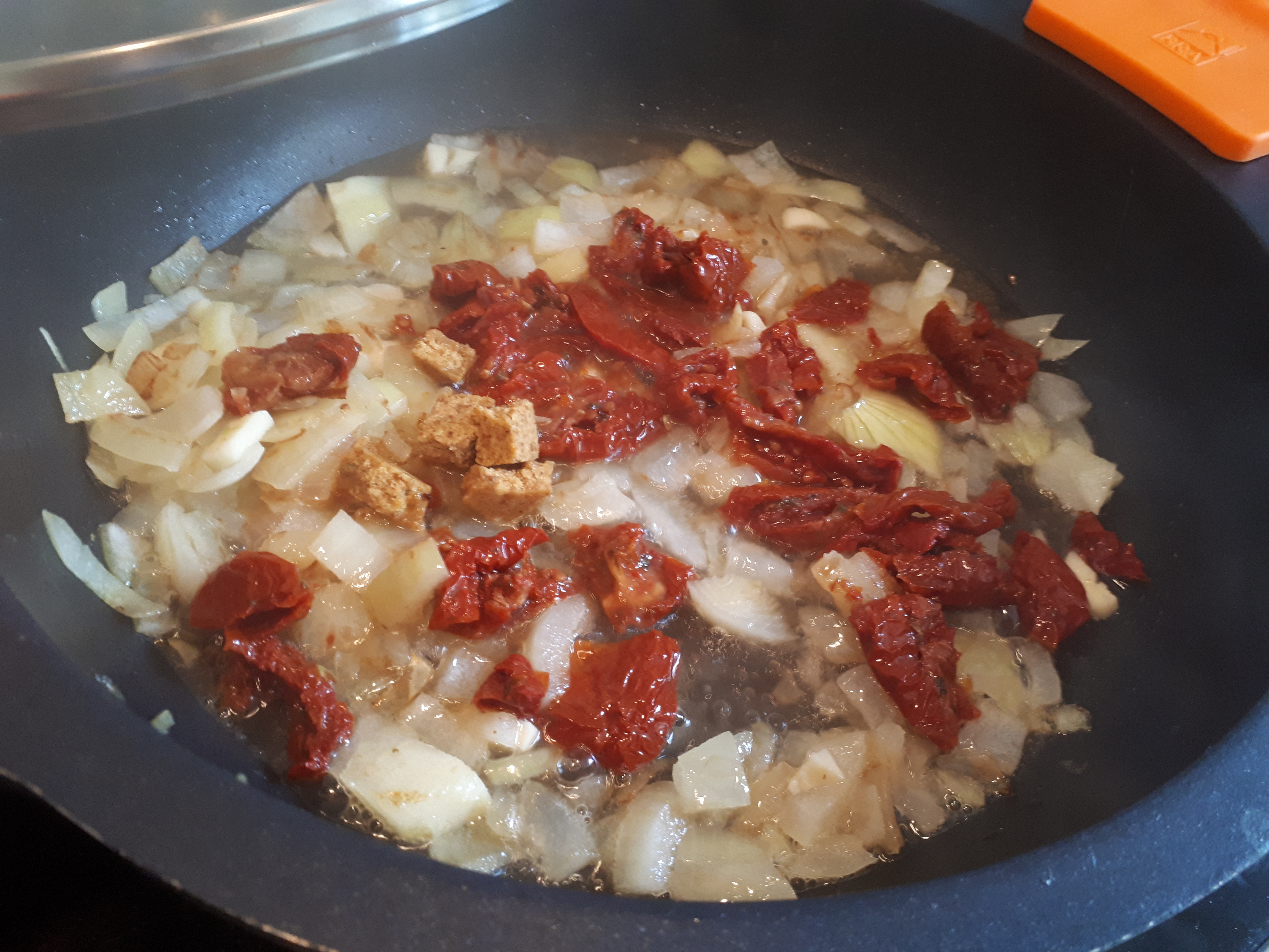 Escurrimos los tomates y los cortamos en trozos de unos 2 dedos (no demasiado pequenos, para que se noten!). Los incorporamos a la cazuela anterior, agregando un poco de su aceite si la cazuela estaba algo seca. Si empleamos tomates secos, los deberemos rehidratar con agua caliente el tiempo que indique el envase.