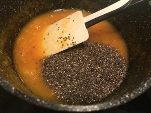 Incorporamos a la fruta cocinada la miel/azúcar y las semillas. Removemos bien. OJO, no os preocupéis por lo líquida que queda: la chia la ponemos precisamente por su capacidad de espesar con las horas, por tanto tened fe en que dotará a nuestra mezcla de esa viscosidad que requieren las mermeladas!