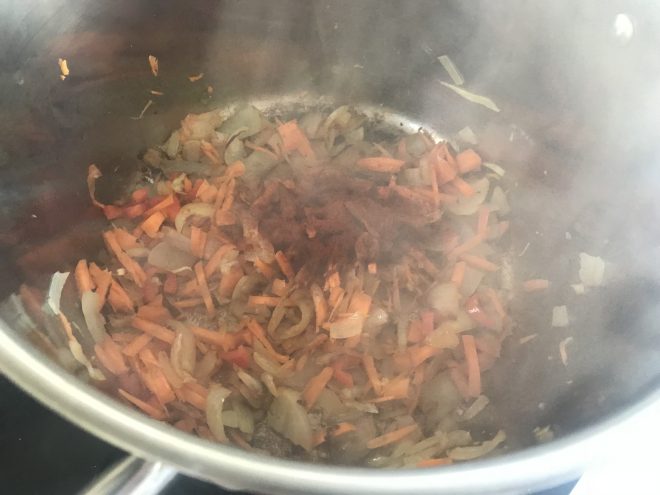 Picamos la zanahoria y el chile (en su caso) también en trozos pequeños y los incorporamos. Lo dejamos 5 minutos tapado.