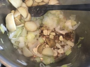 Retiramos la parte verde de los puerros, los cortamos a lo largo y los lavamos bien (siempre tienen tierra dentro). Los cortamos en rodajas medianas y los ponemos a pochar en esa cazuela.