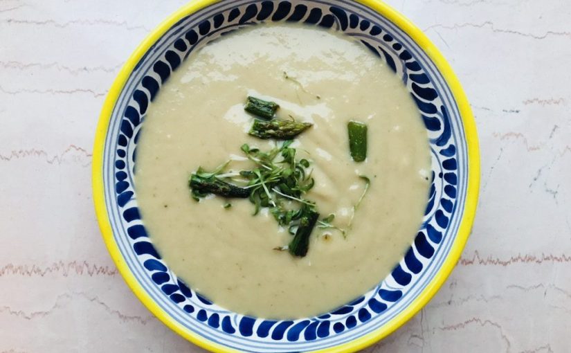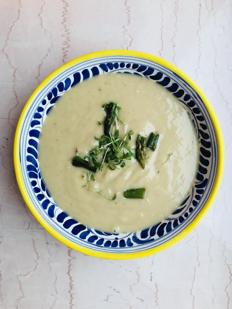 Hace poco encontré en el maravilloso blog de 24 zanahorias esta crema fría que he preparado prácticamente igual que la autora, y que comparto con vosotros porque ha sido una auténtica delicia! Tiene un sabor parecido a la vichysoisse, es finísima y depurativa, gracias a las propiedades diuréticas de los espárragos.