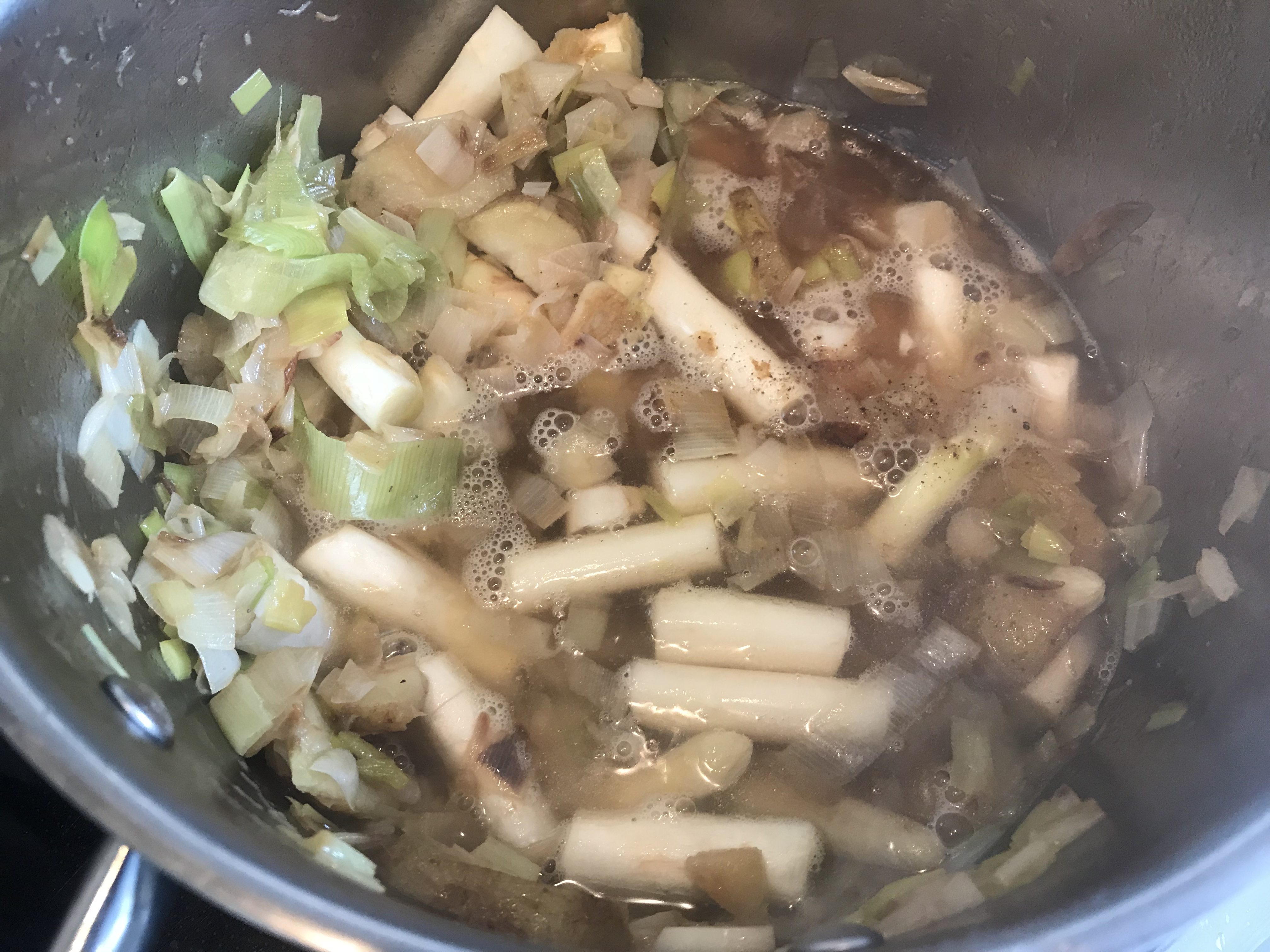Dejamos 2 minutos y agregamos los espárragos blancos escurridos (si eran en conserva) o tal cual pero cortando lo más leñoso del tallo – unos 2 dedos (si eran frescos).