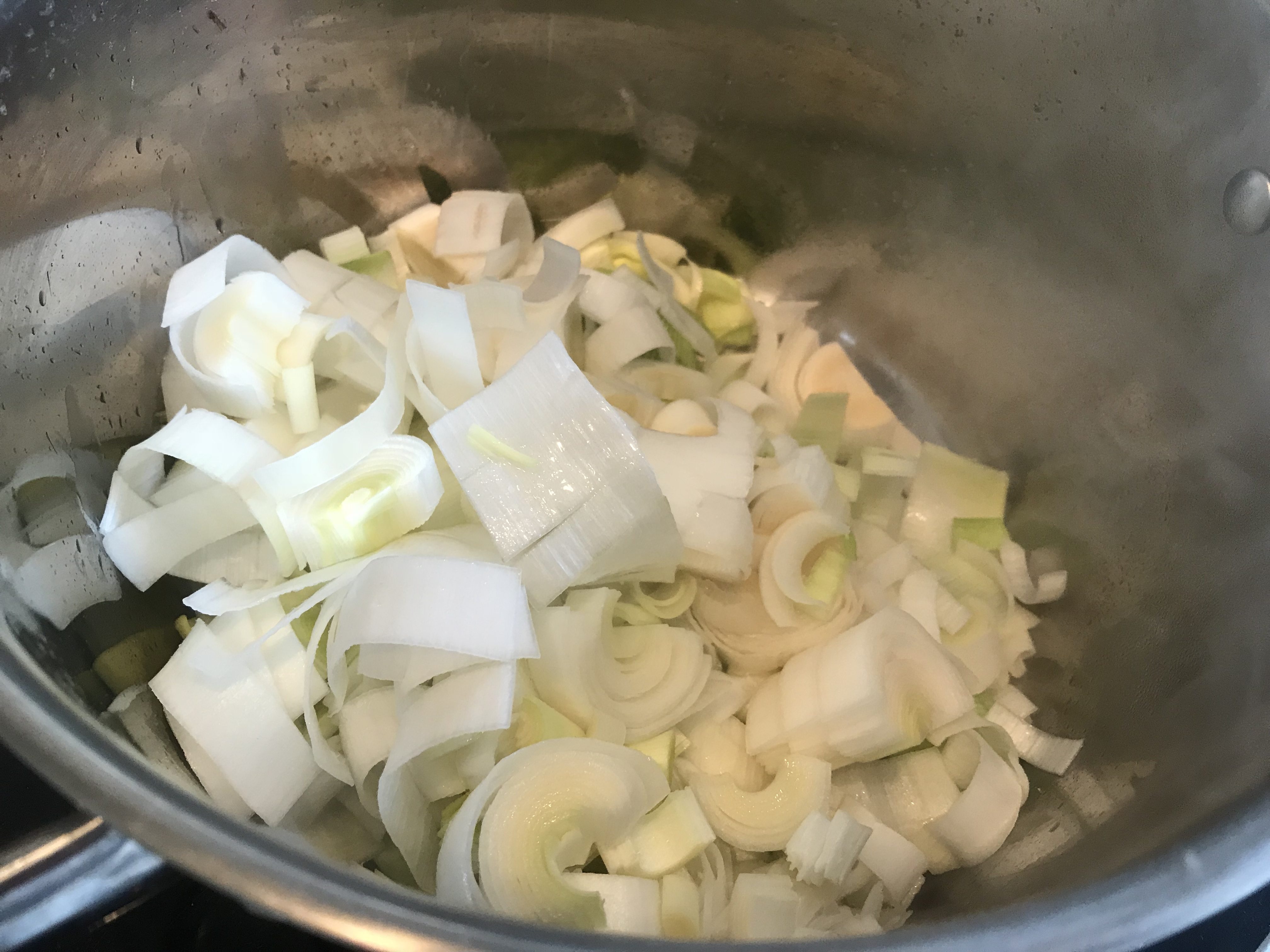Retiramos la parte verde de los puerros, los cortamos a lo largo y los lavamos bien (siempre tienen tierra dentro). Los cortamos en rodajas medianas y los ponemos a pochar en esa cazuela.