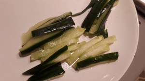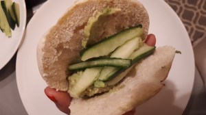 Colocamos sobre cada tortilla (o dentro de la pita abierta por la mitad y ligeramente tostada en el tostador) unos pocos bastoncitos de pepino, una cucharada de la crema de aguacate y 2 de la de atún.