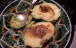 En otro bol machacamos en aguacate con el zumo de limon, la cayena picada/en copos y un poquito de sal y pimienta.