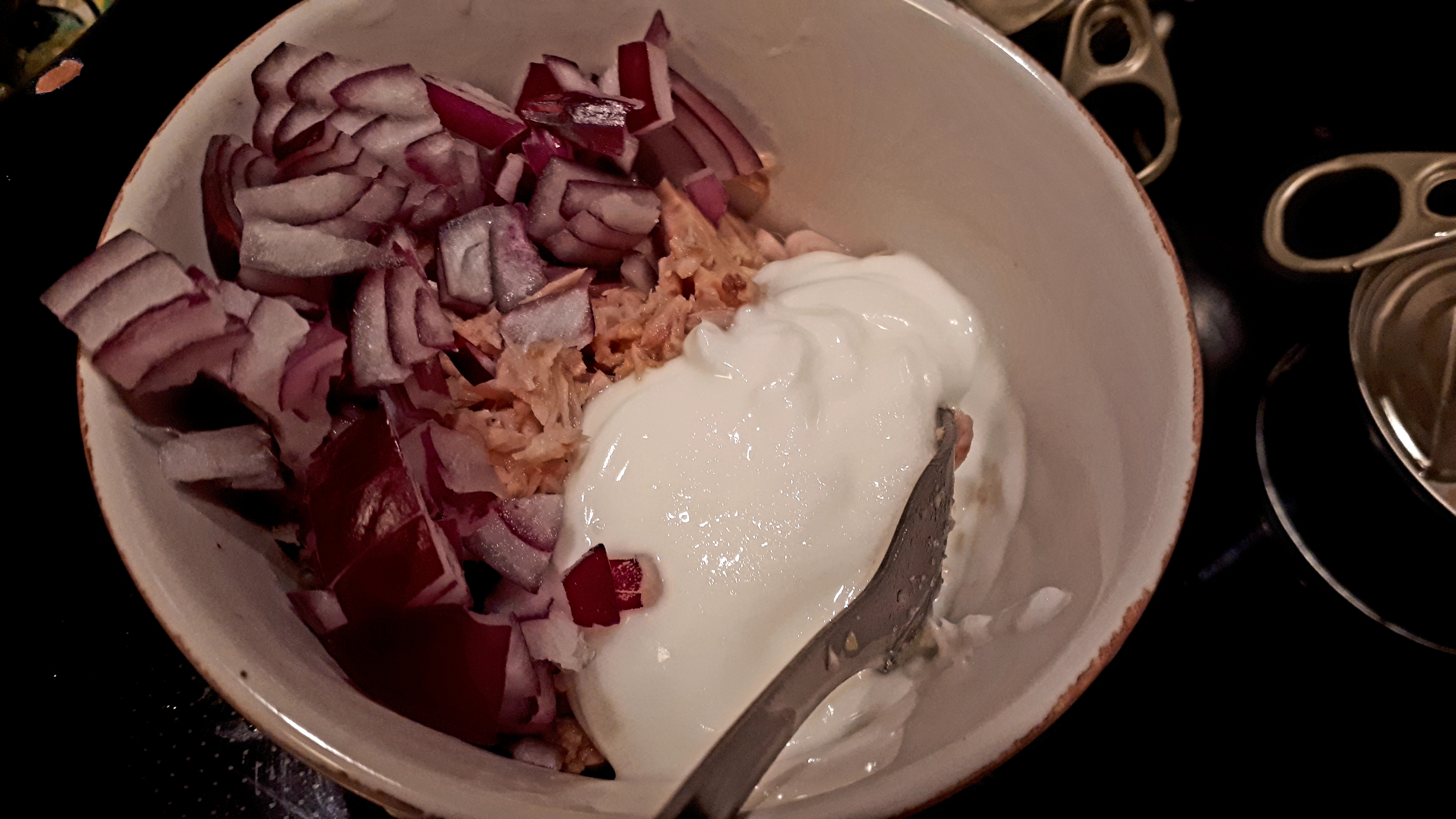 Mezclamos en un bol el atún escurrido con el yogur, la cebolla picada fina y un poco de sal.