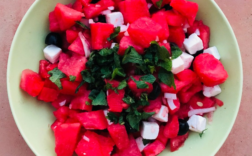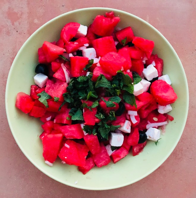 Ensalada de sandía, queso feta y aceitunas