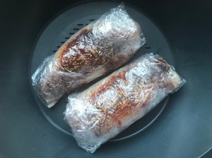 – Thermomix: llenamos la thermomix con 300 ml de agua, ponemos los paquetitos en el recipiente varoma y programamos 20-30 minutos (el recipiente sobre la thermomix) temperatura varoma velocidad 1. El tiempo depende de si estaban muy frías de la nevera o no, y de lo gruesas que sean.