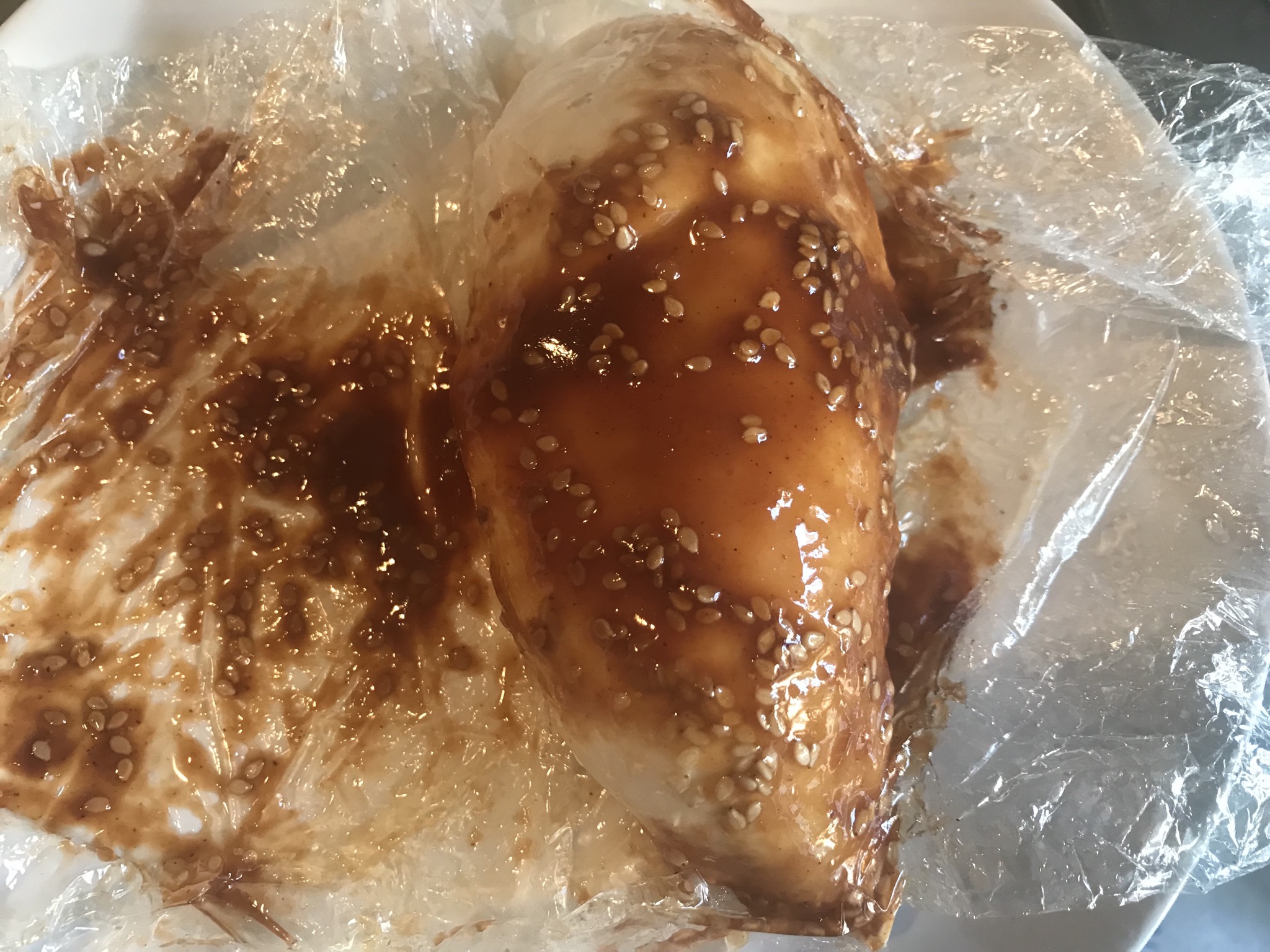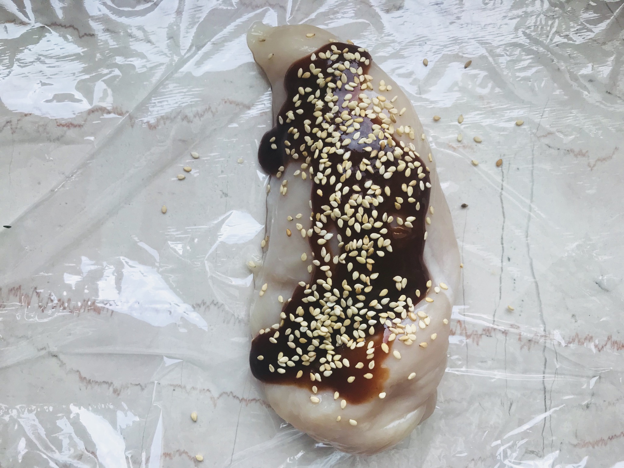 Tomamos las pechugas de pollo y las pasamos cada una a su papelito. Las embadurnamos muy bien por encima con la salsa barbacoa y ponemos también las verduras y sésamo en su caso.