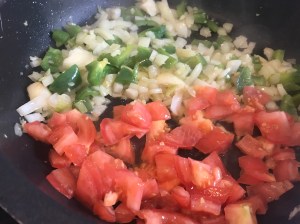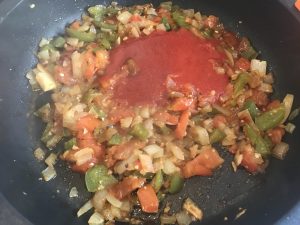 Añadimos el tomate frito y el vino y subimos a fuego fuerte para que se evapore el alcohol, 1 minuto.