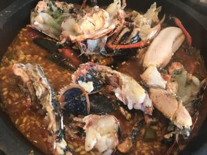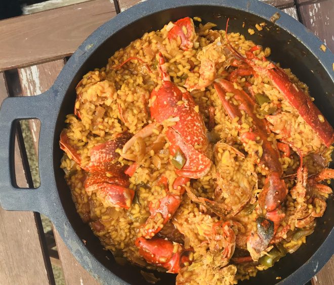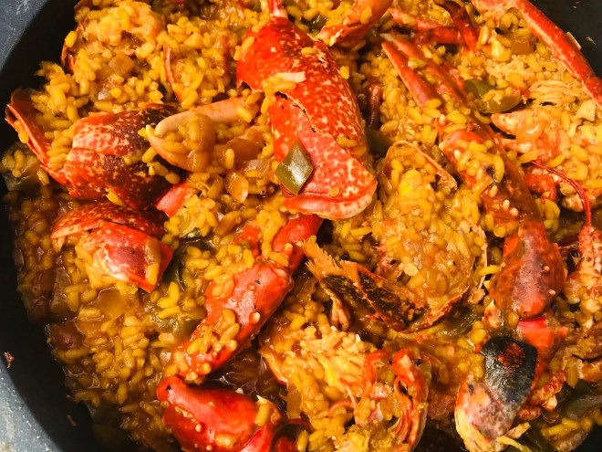 Dejamos que siga cocinando todo el tiempo que necesite el arroz hasta que esté en su punto (id probando y dando vueltas de vez en cuando), más o menos 15 min. Con la tapa abierta y cerrada, alternando para que todos los granos de arroz estén sumergidos en algún momento. Veréis que el bogavante pasa de ser gris a rojo intenso!