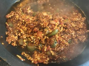 Por último echamos el caldo de pescado (o el agua+pastilla), la proporción es del doble del volumen de arroz, pero más o menos vamos viendo si necesita más o no.