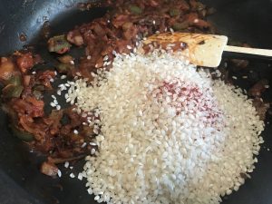 Agregamos el arroz y el azafrán y damos unas vueltas para que se dore.