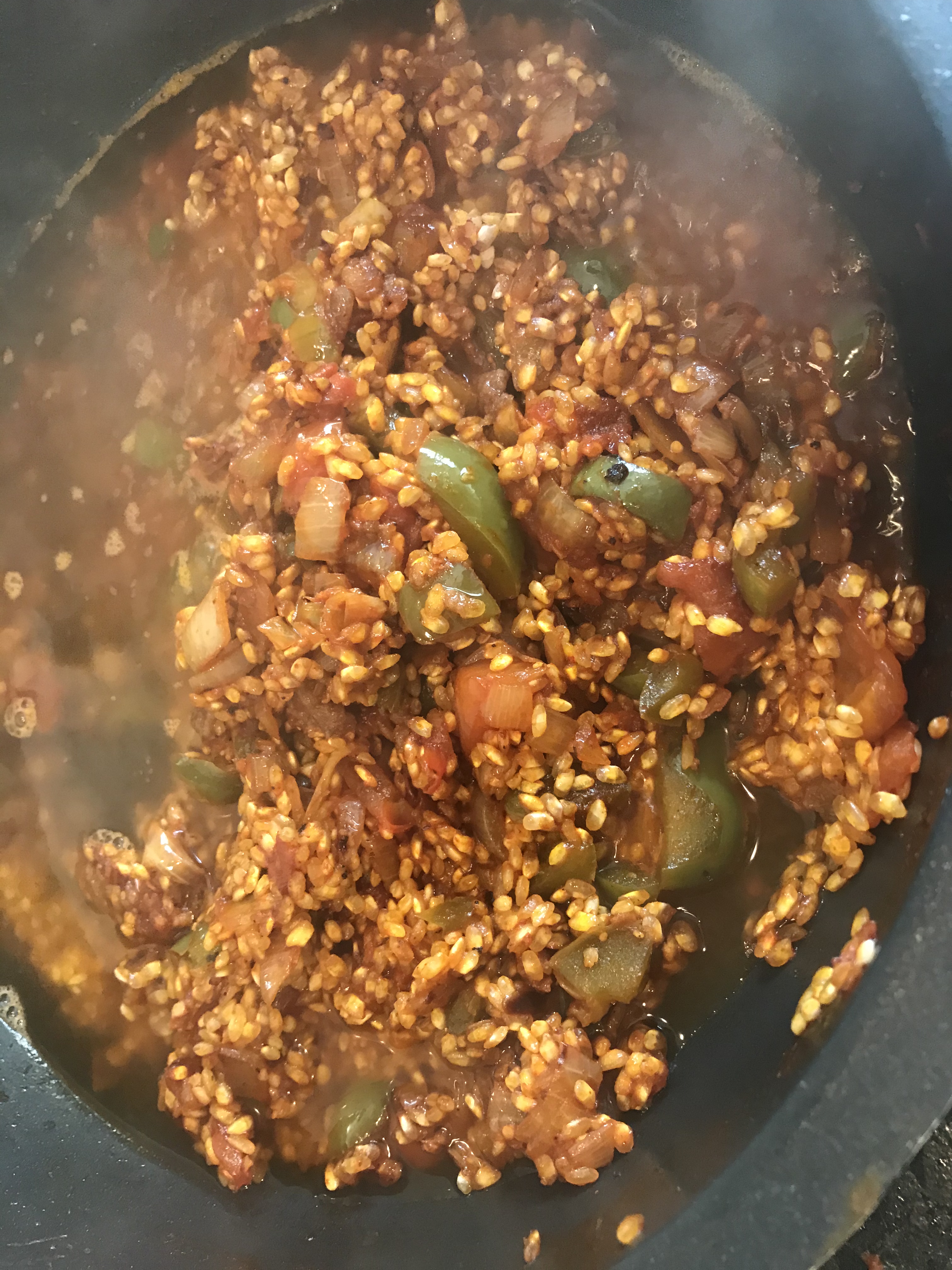 Por último echamos el caldo de pescado (o el agua+pastilla), la proporción es del doble del volumen de arroz, pero más o menos vamos viendo si necesita más o no.