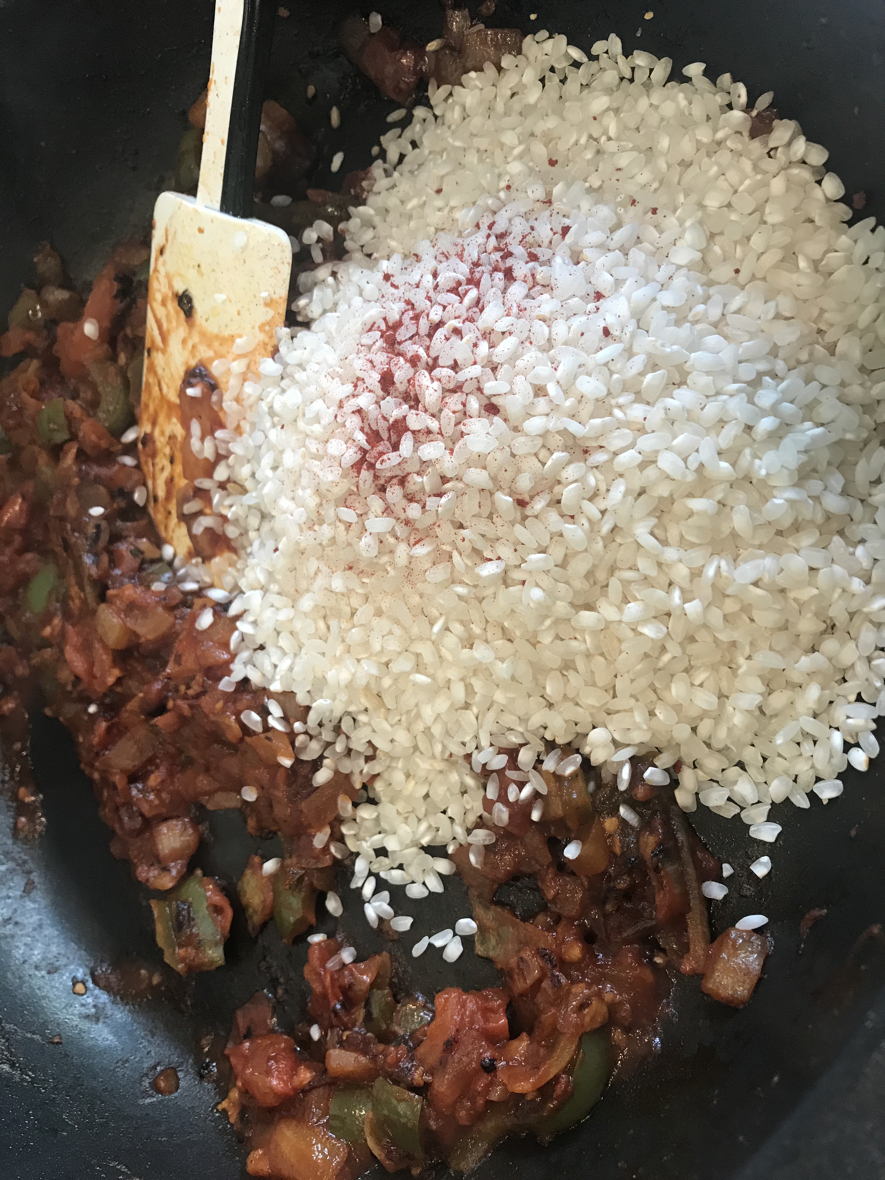 Agregamos el arroz y el azafrán y damos unas vueltas para que se dore.