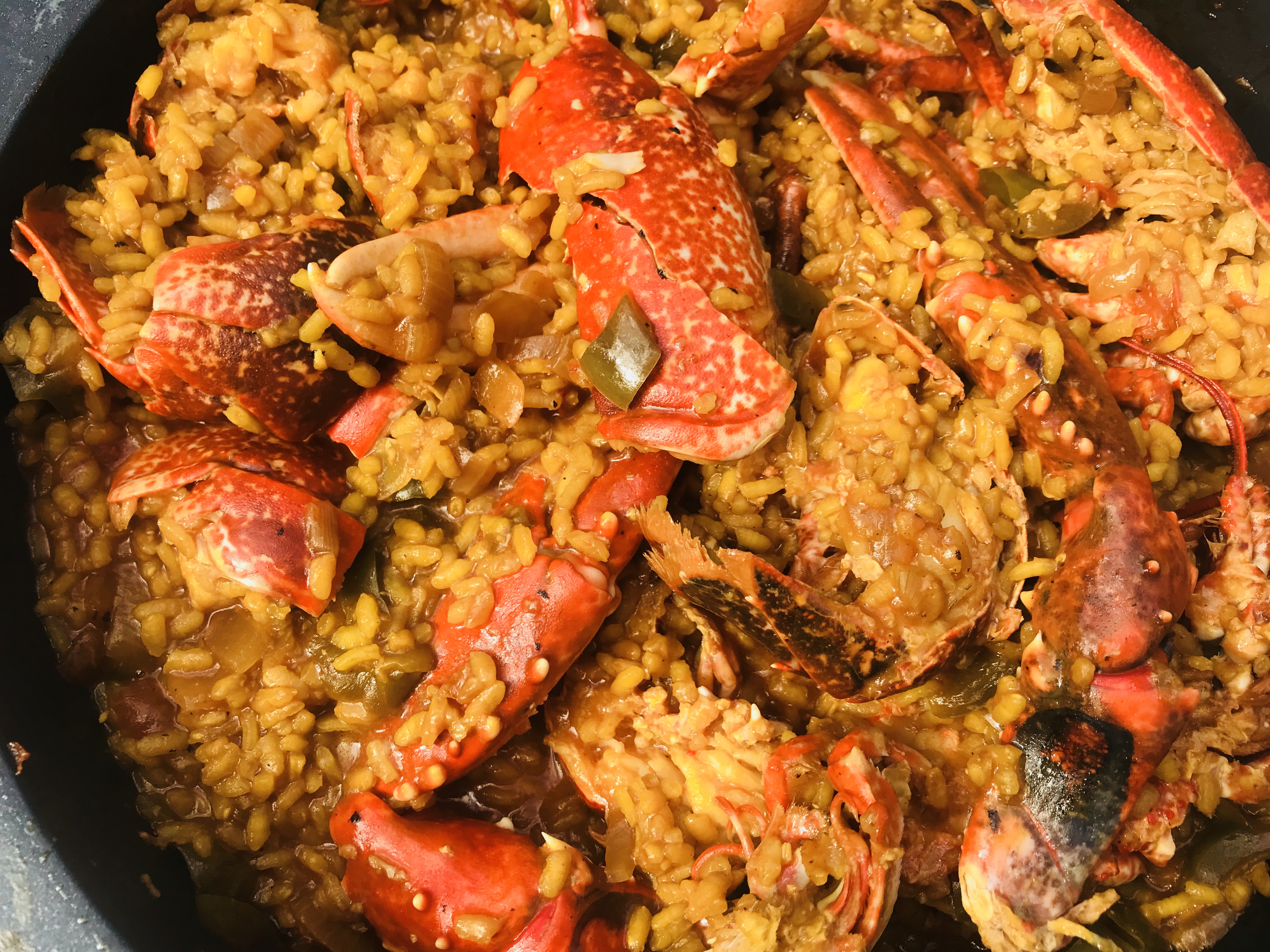 Dejamos que siga cocinando todo el tiempo que necesite el arroz hasta que esté en su punto (id probando y dando vueltas de vez en cuando), más o menos 15 min. Con la tapa abierta y cerrada, alternando para que todos los granos de arroz estén sumergidos en algún momento. Veréis que el bogavante pasa de ser gris a rojo intenso!