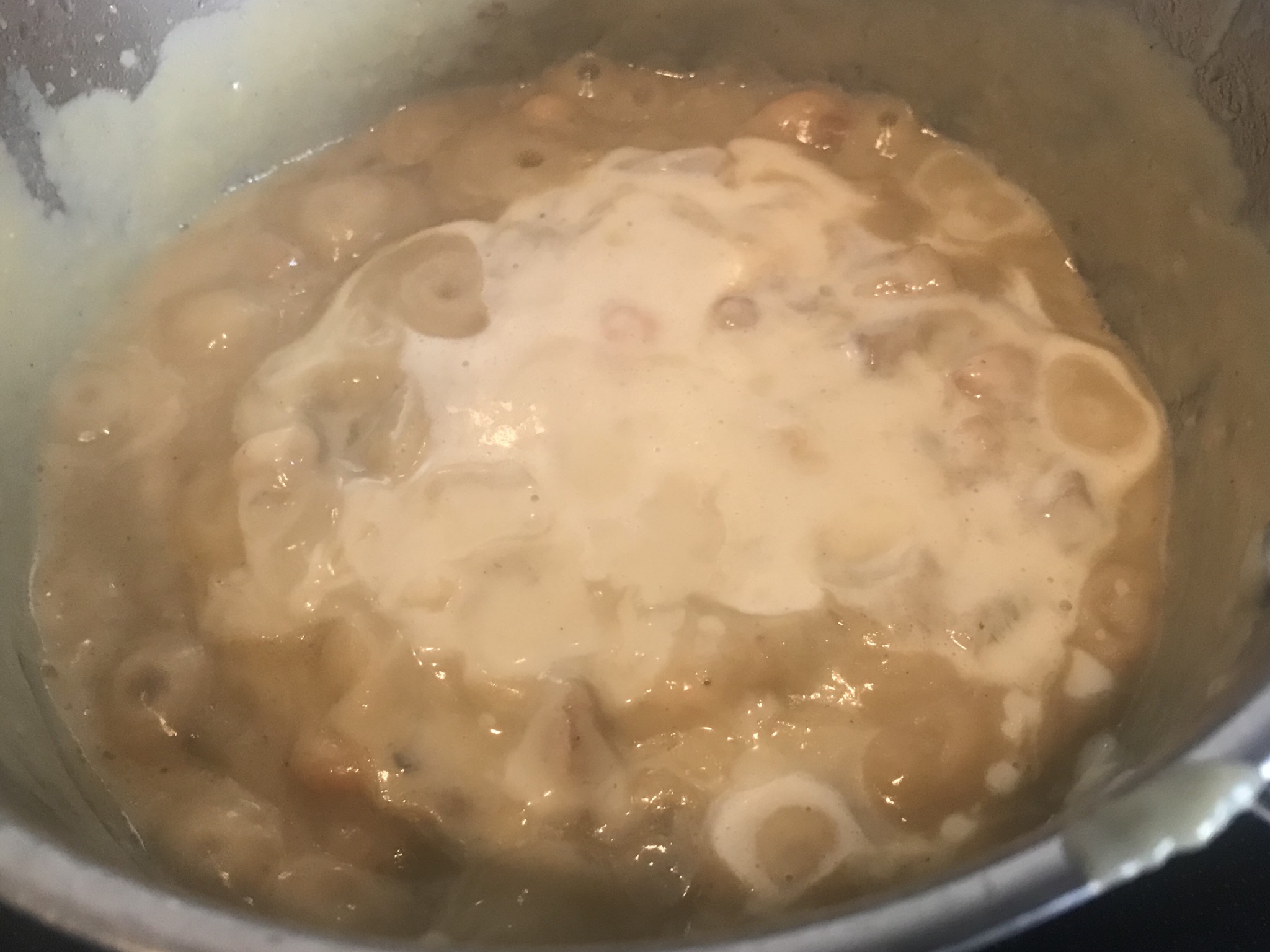 - Agregamos la leche y dejamos que siga cociendo pero a fuego más suave, otros 5 minutos.