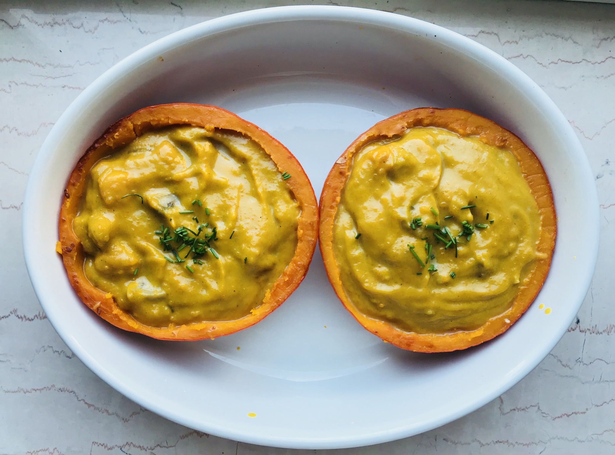 Rellenamos la piel de la calabaza con todo esto, y LISTO!