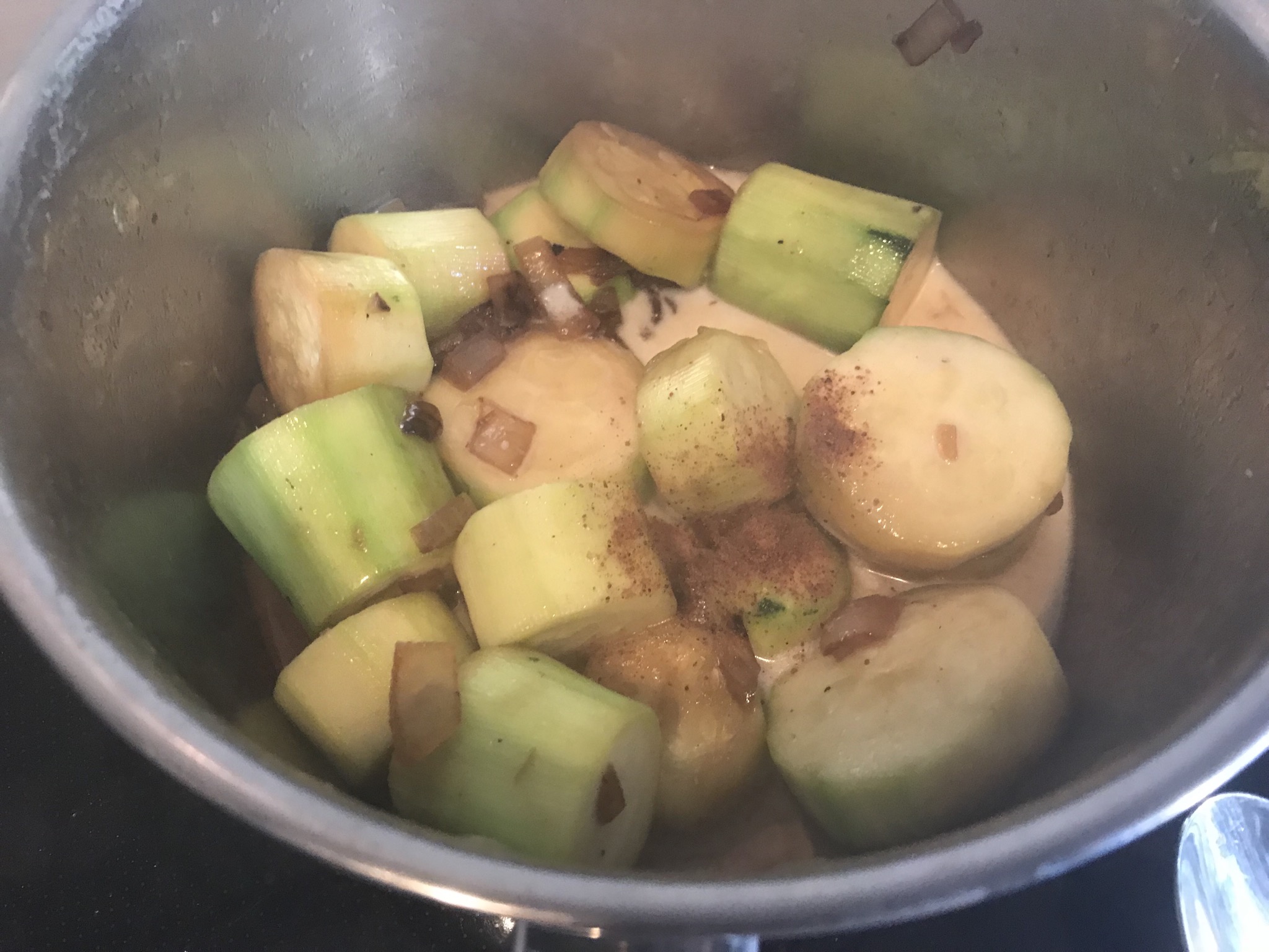 - Pelamos bien el calabacín (importante! si no quedará bechamel verde…), lo troceamos y lo incorporamos con la cebolla. Tapamos y dejamos que se cocine 8 minutos a ese mismo fuego medio.