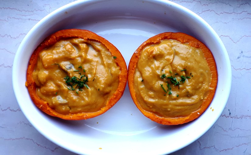 La verdad es que nunca se me había ocurrido rellenar una calabaza. Las había visto en mil blogs, libros etc, pero no sé por qué no me había animado, ninguna receta me convencía porque a todas les encontraba falta de jugosidad… no sé!