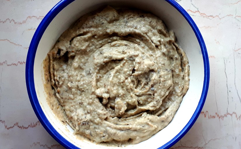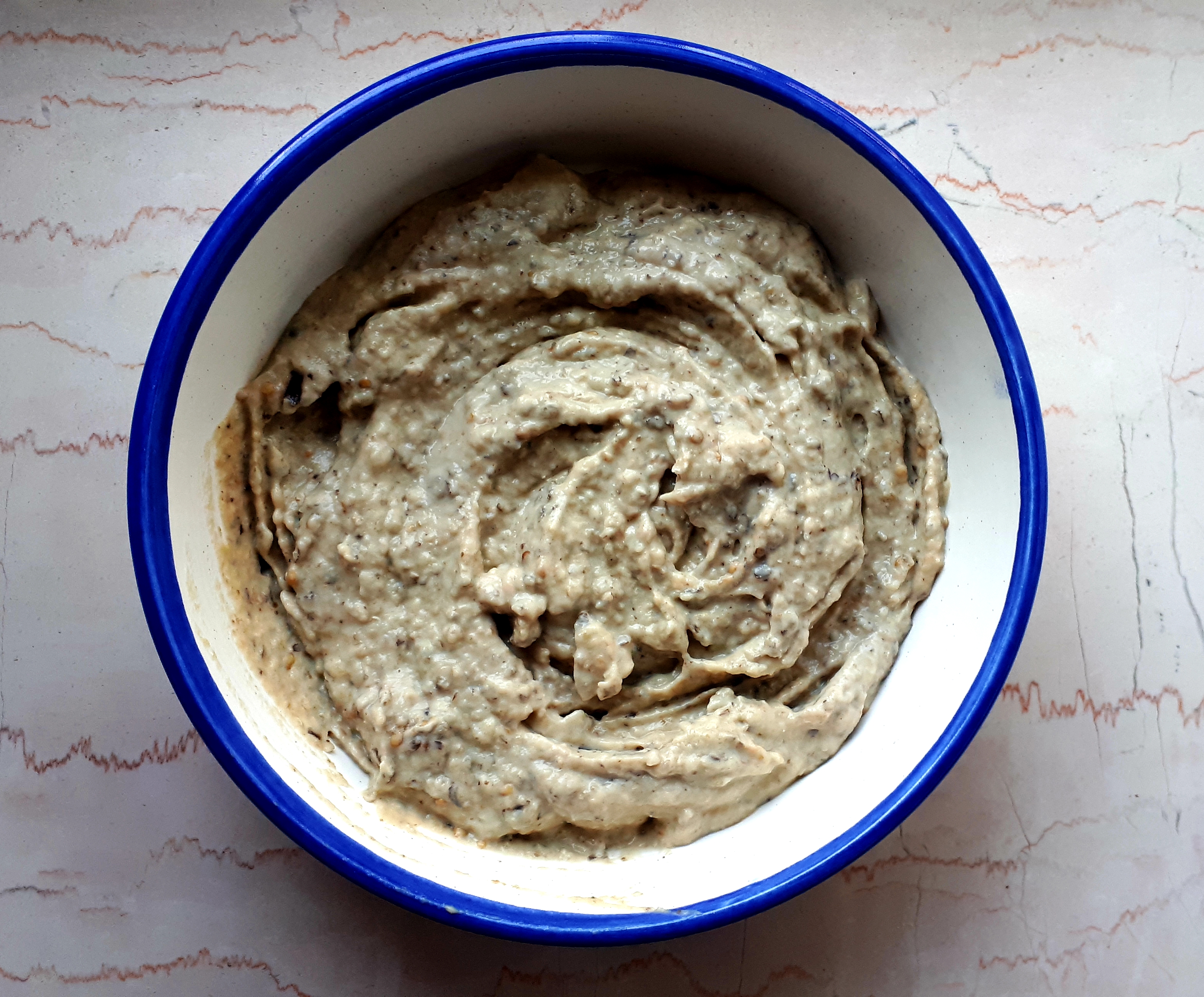 Trituramos la berenjena con los demás ingredientes del listado hasta obtener una crema homogénea y ajustamos el sabor a nuestro gusto (lo más ajustable es la cantidad de ajo y la sal).