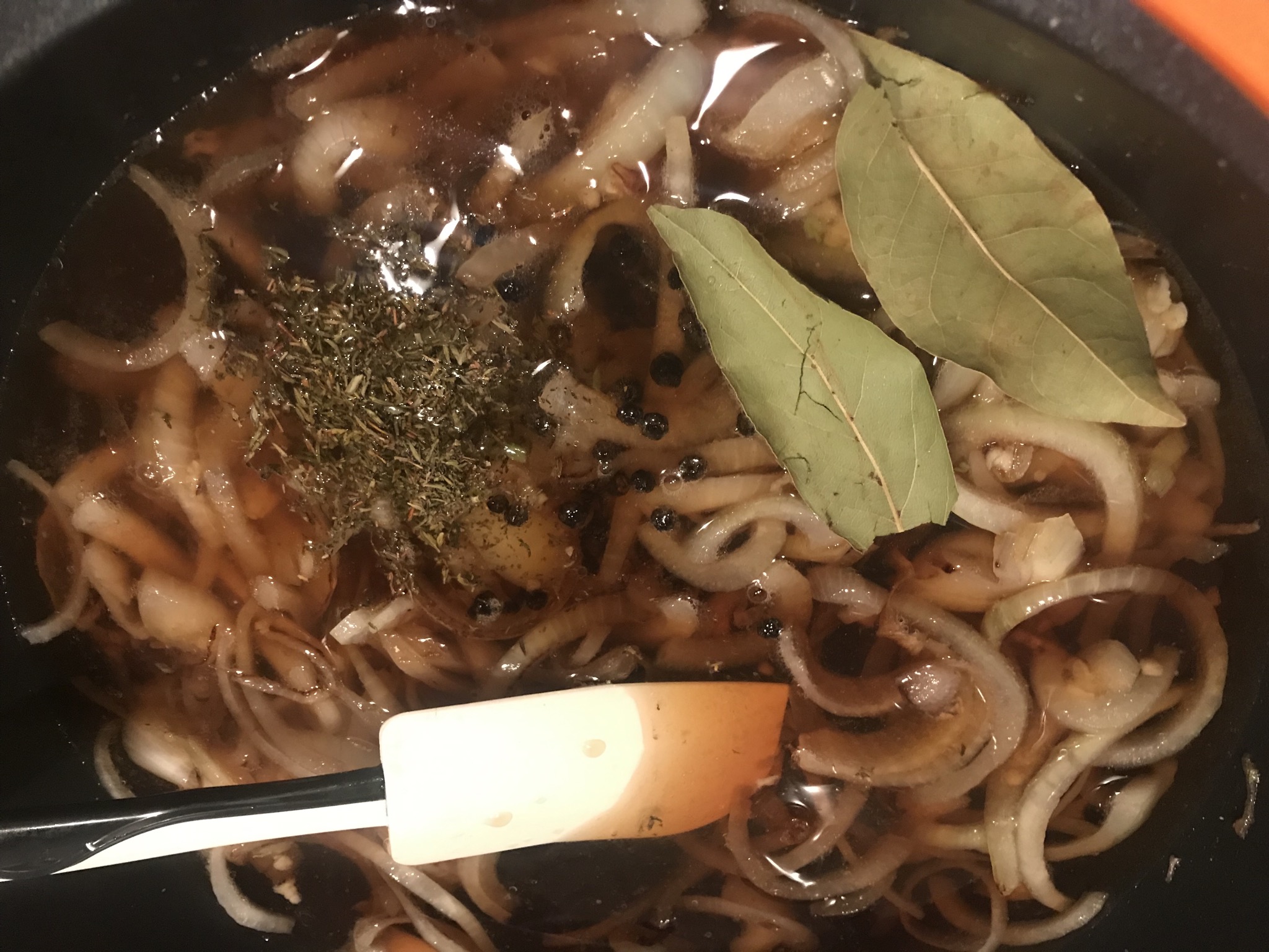 Añadimos la pimienta, el laurel, el tomillo, el vino, el vinagre, y el agua. ES ESENCIAL RESPETAR LAS PROPORCIONES QUE OS SUGIERO, ES LA CLAVE DE ESTA RECETA. Dejamos a fuego fuerte con la tapa abierta durante 5 minutos y cerrada otros 5 minutos.