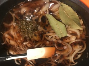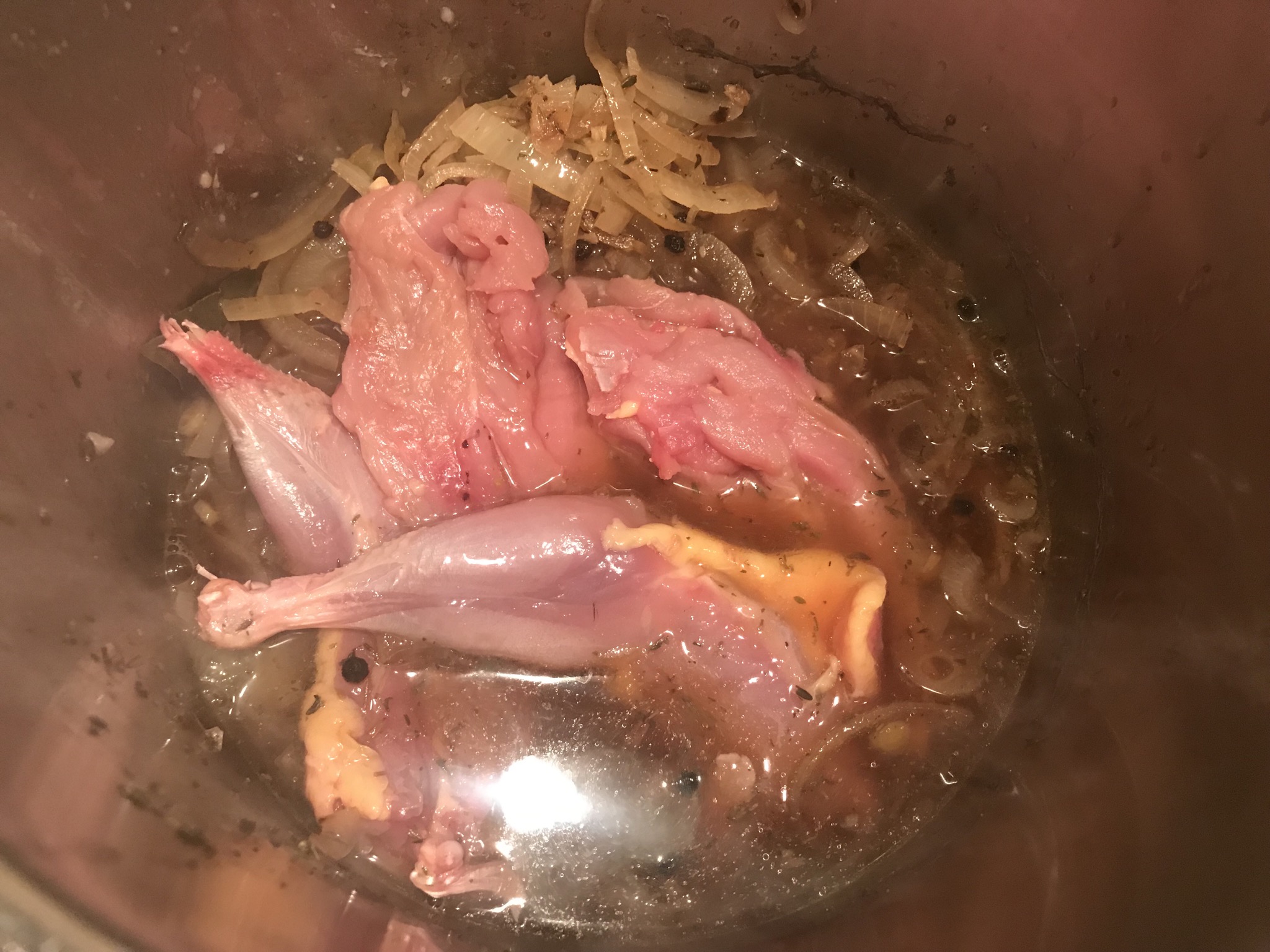 Pasamos el escabeche anterior y el faisán/pollo a la olla express, cerramos y dejamos cocinar 15 minutos contando desde que suben los 3 aritos (recordad que cuando suben hay que bajar a fuego medio-bajo).
