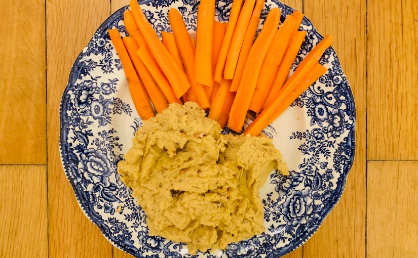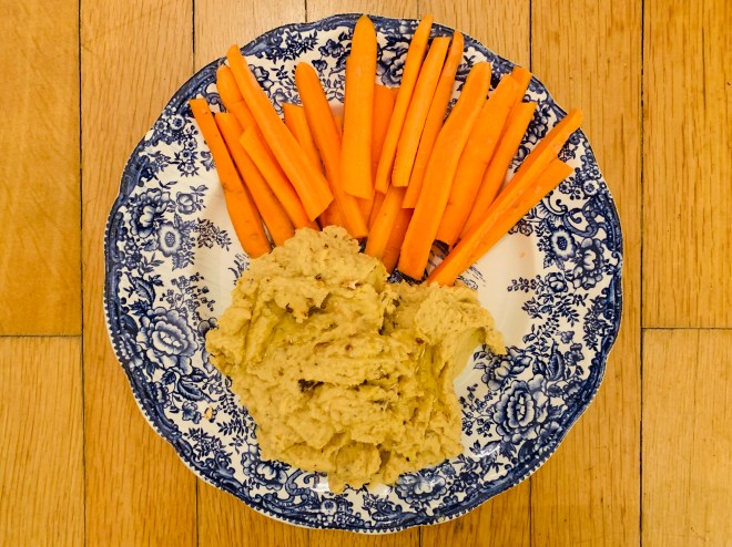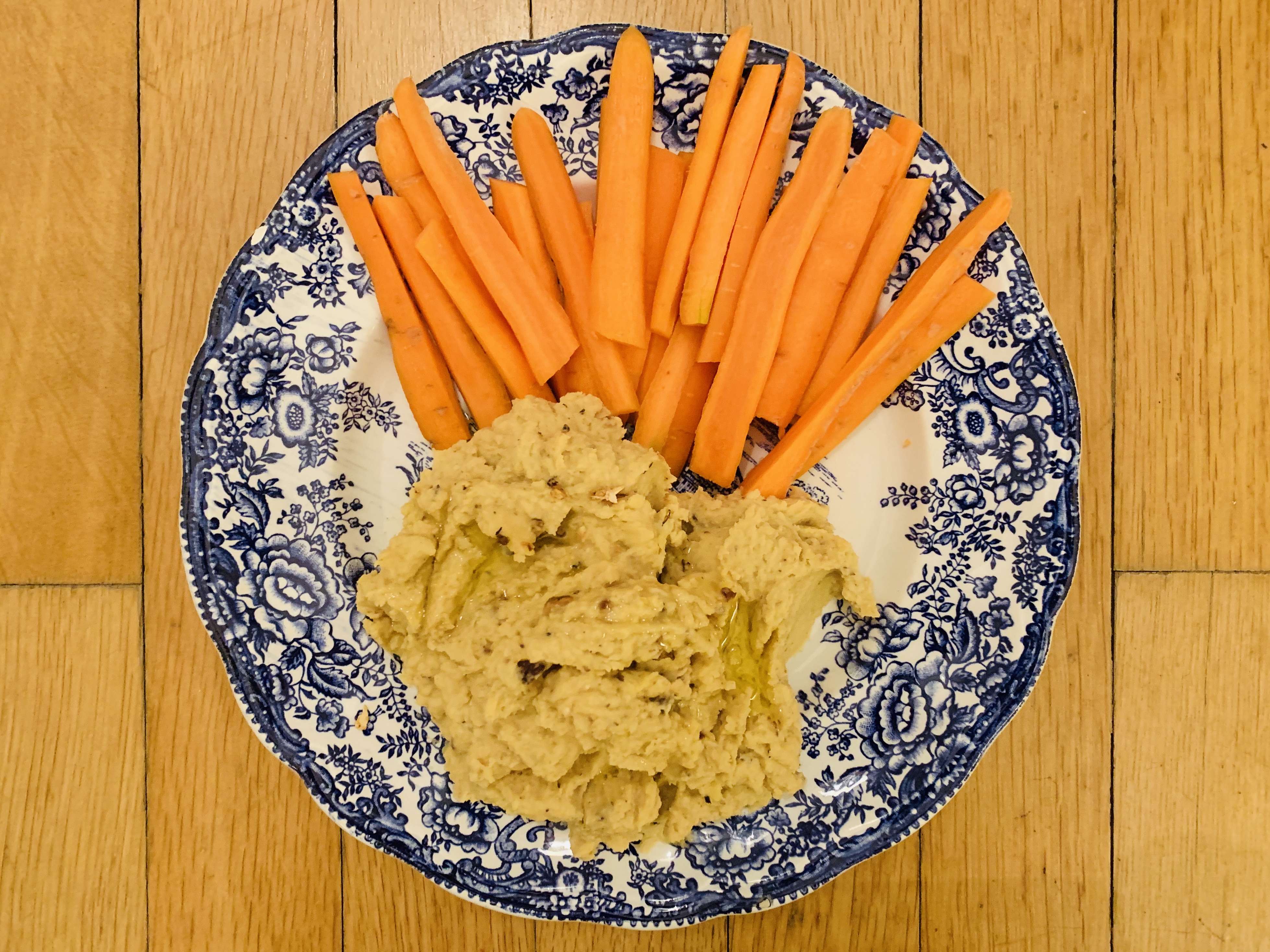 Cortamos las crudités (zanahoria, pepino, rabanitos…) en palitos o tostamos las pitas.