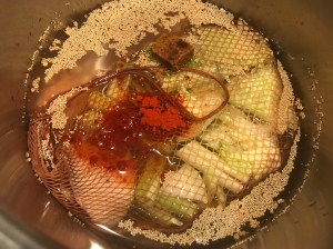 Cuando vayamos a cocinar, colocamos todos los ingredientes en una cazuela menos el vinagre (mejor, olla express) y cubrimos con agua 2-3 dedos por encima del contenido.