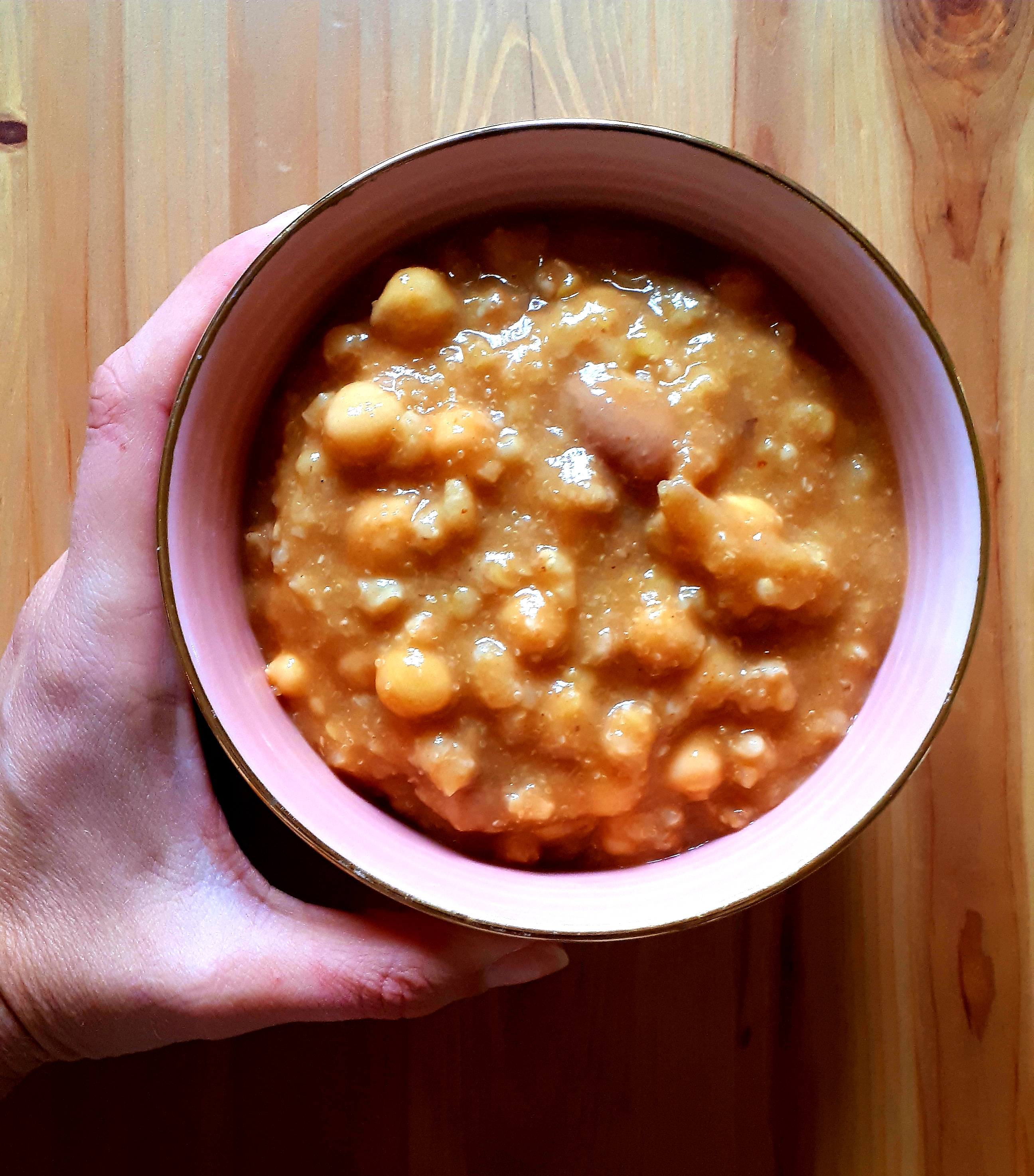 Otro punto a favor de este guiso es que nutricionalmente las legumbres son deficitarias en algunos aminoácidos que sí contienen los cereales, por lo que combinar ambos nos permite disfrutar de una proteína tan completa como un chuletón pero sin sus grasas no tan recomendables jeje.