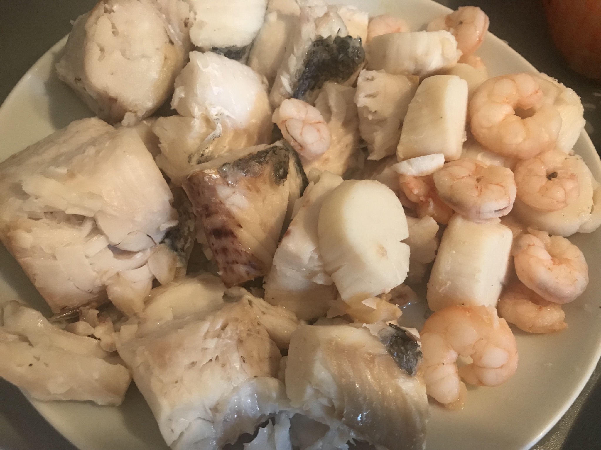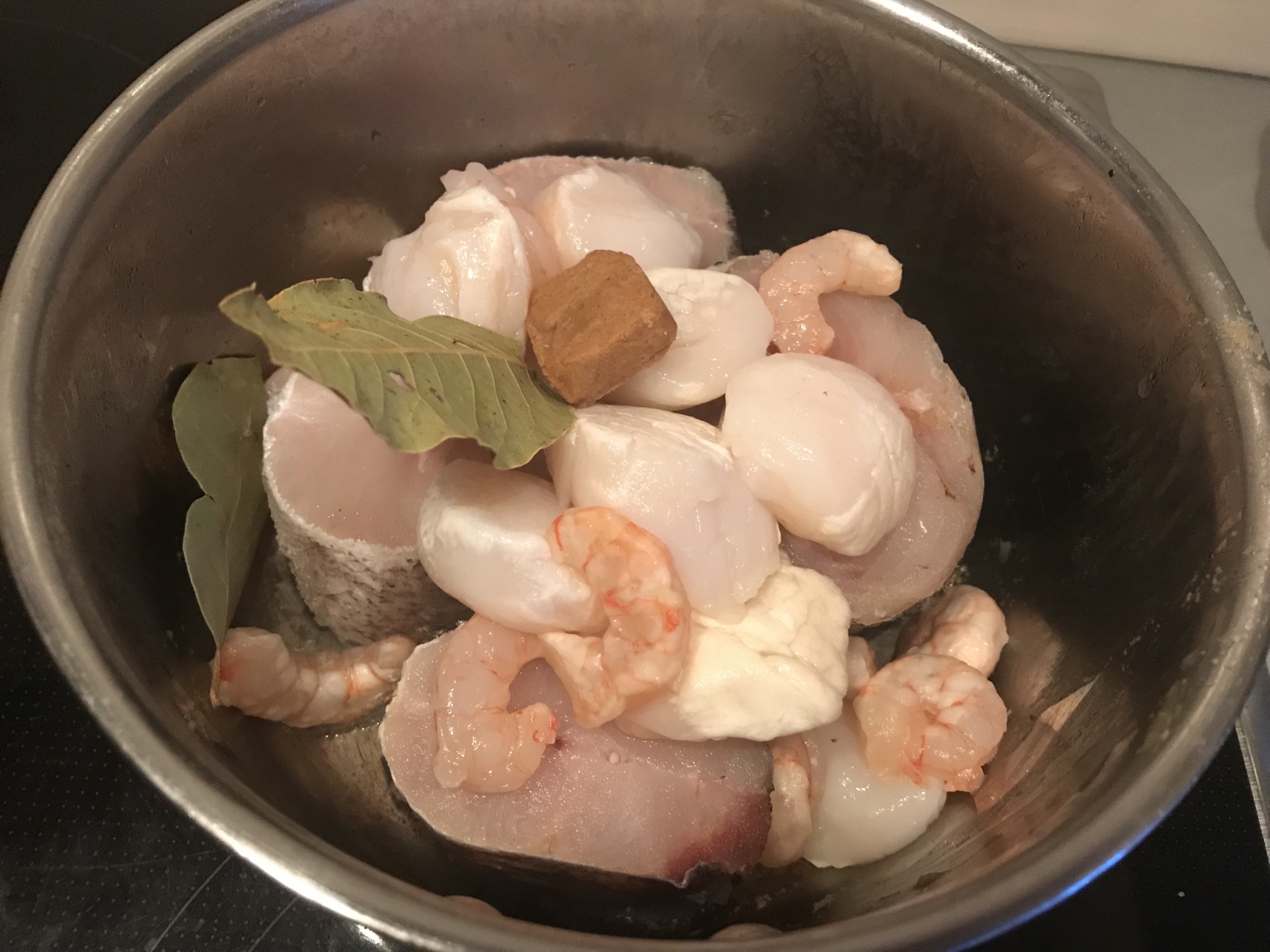 Mientras tanto, vamos cociendo vieiras, gambas y merluza. Las ponemos tal cual en una cazuela con el laurel y una cucharadita de sal.