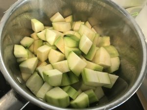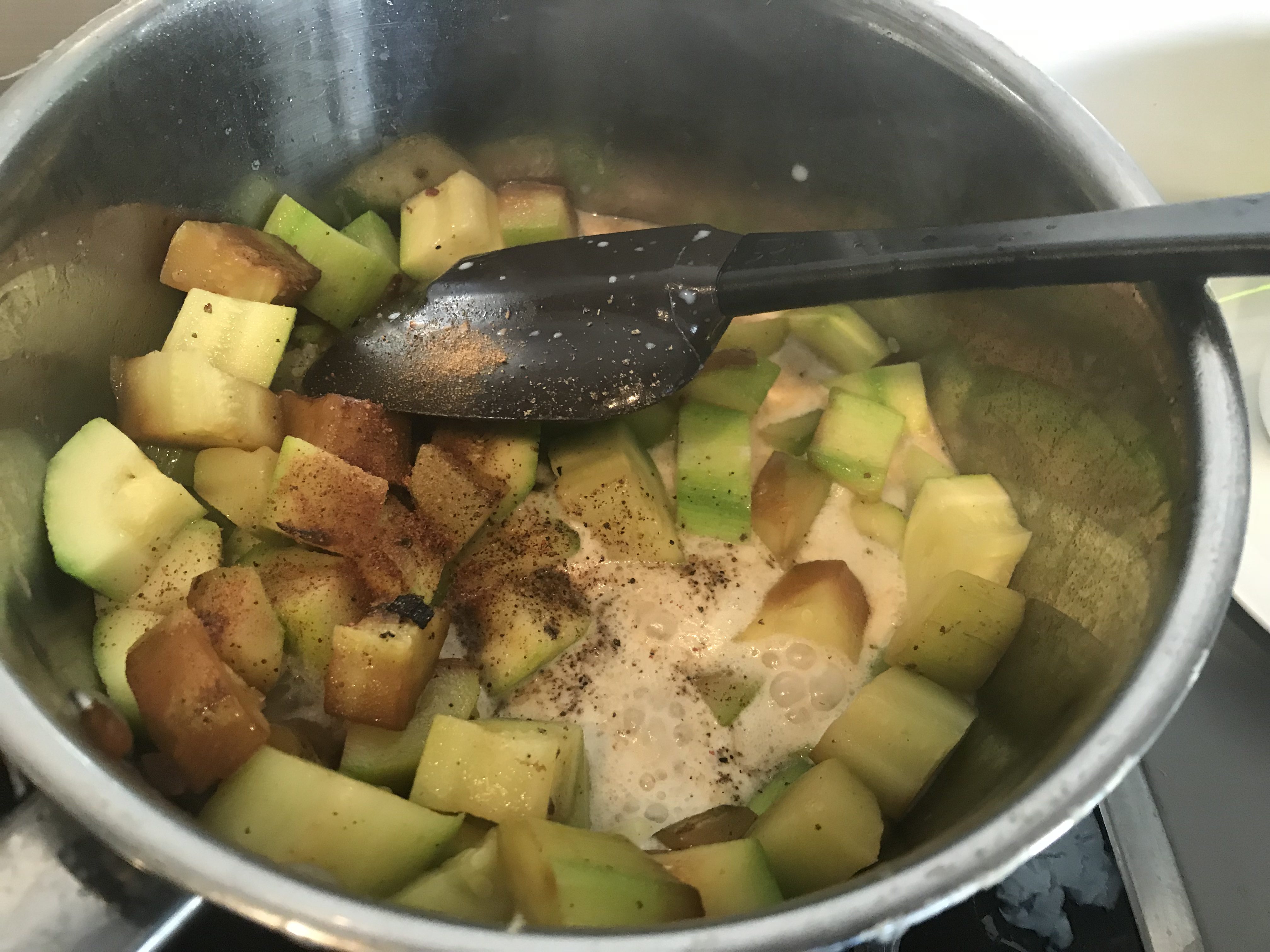 - Pelamos bien el calabacín (importante! si no quedará bechamel verde…), lo troceamos y lo incorporamos con la cebolla. Tapamos y dejamos que se cocine 8 minutos a ese mismo fuego medio.