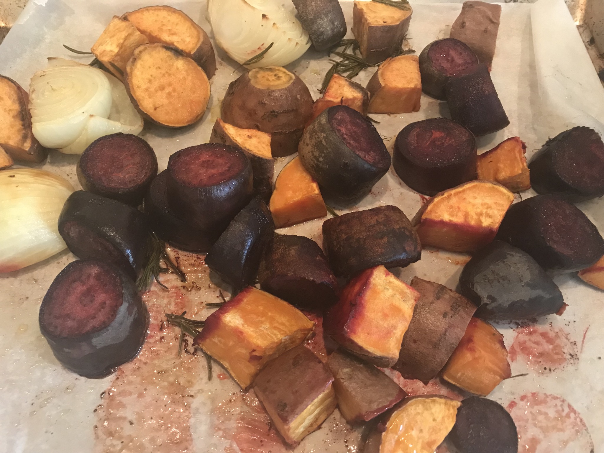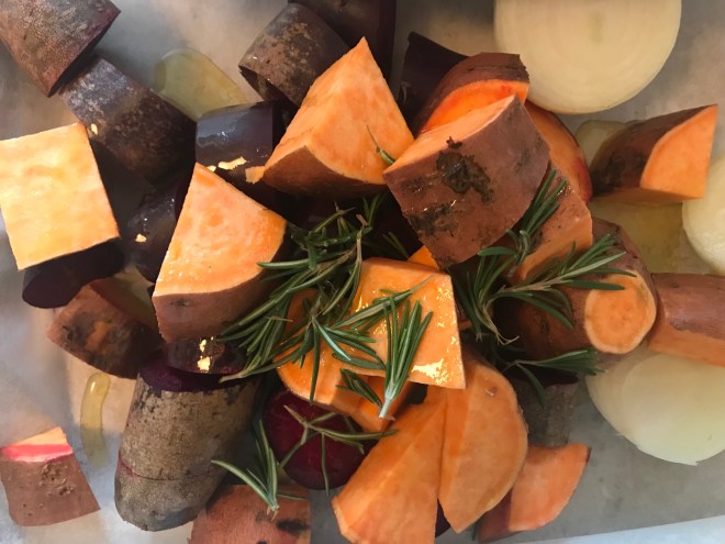 Ponemos un chorrito de aceite por encima de las verduras para evitar que se sequen, e intentamos que se impregnen bien. Ponemos también el romero en la bandeja y horneamos unos 30-40 minutos, lo necesario para que el boniato esté tierno (lo demás importa menos).