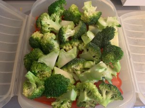 Comenzamos cocinando el brócoli. Para ello, lo lavamos bien y lo cortamos en pequeños arbolitos. Lo cocemos al vapor en el microondas 5 minutos en un estuche de vapor tipo lekué, o bien en un cazo con agua hirviendo el mismo tiempo.