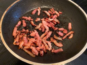 Procedemos con el bacon. Lo tostamos en una sartén sin nade de aceite hasta que esté cruijientito.