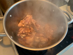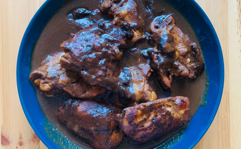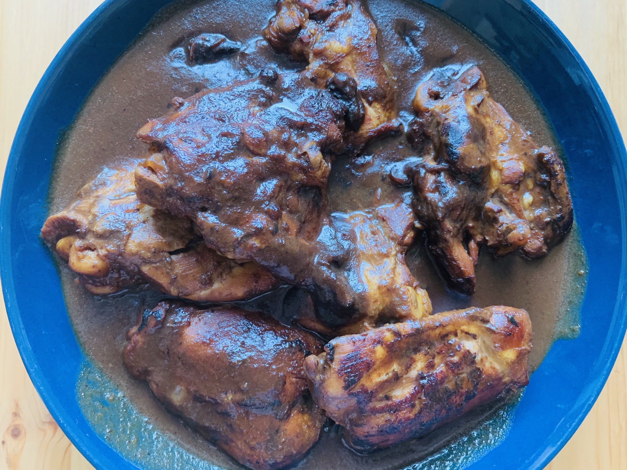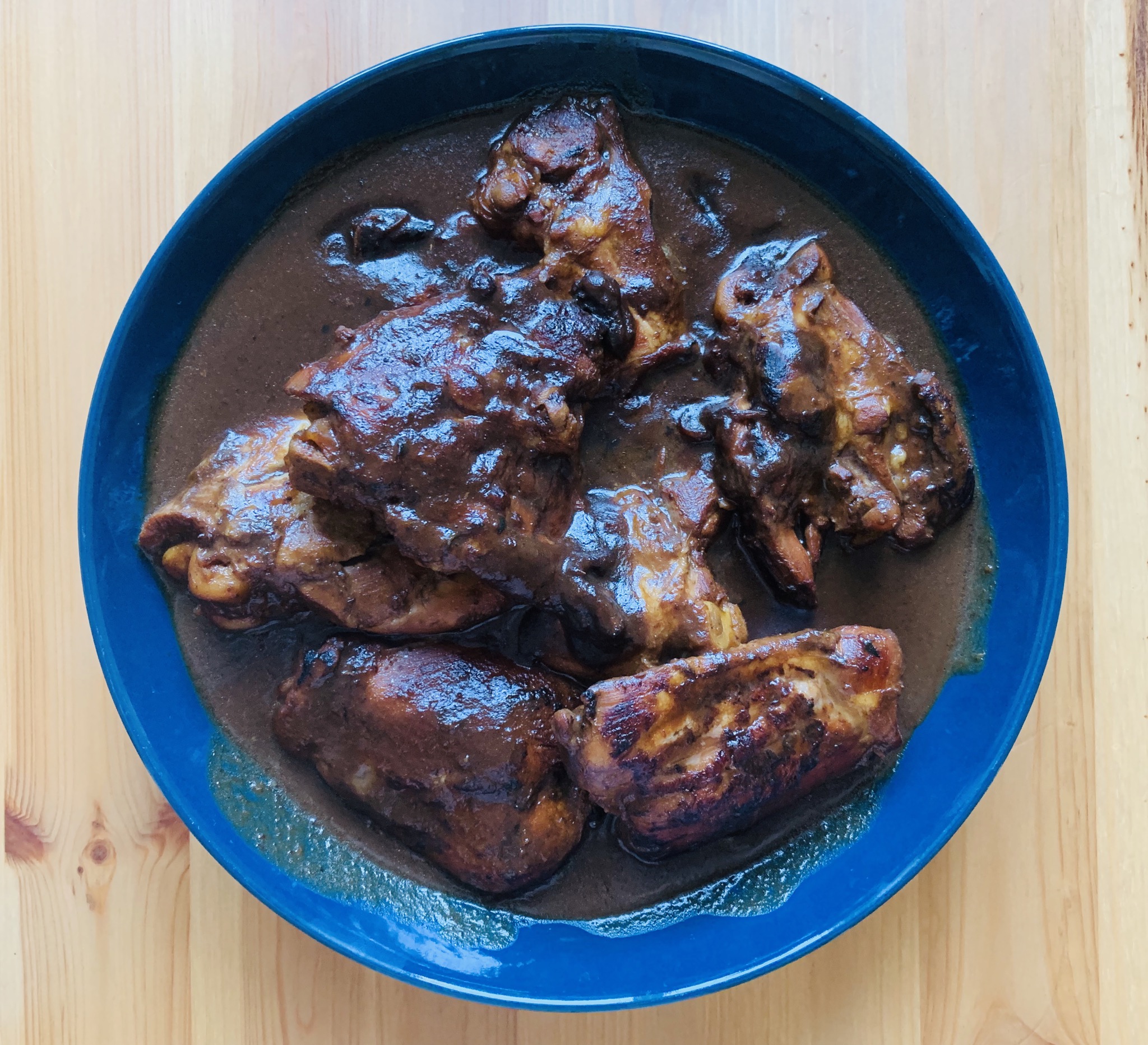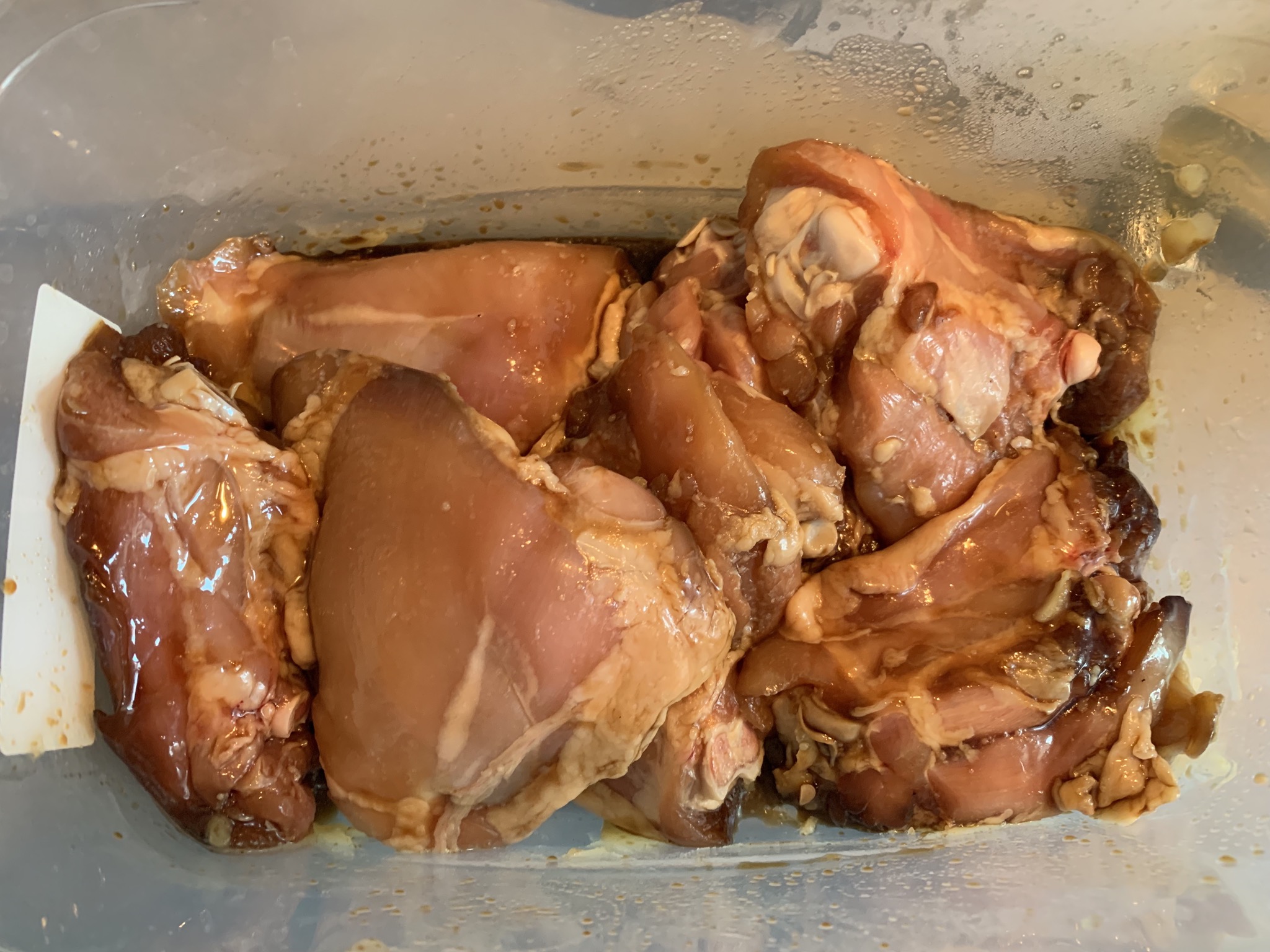 Al menos 2 horas antes de cocinar (mejor, toda la noche), ponemos a marinar/adobar el pollo en un cuenco grande con los ingredientes indicados en “para el marinado”. Tapamos con papel film y lo dejamos reposar en la nevera.