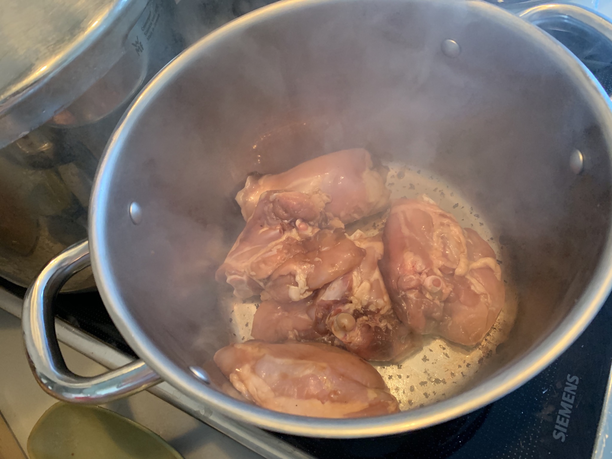 A continuación, doramos el pollo en una cazuela (bien escurrido; el líquido sobrante del adobo podéis agregarlo a la salsa que hemos triturado) unos 2 minutos por cada lado.