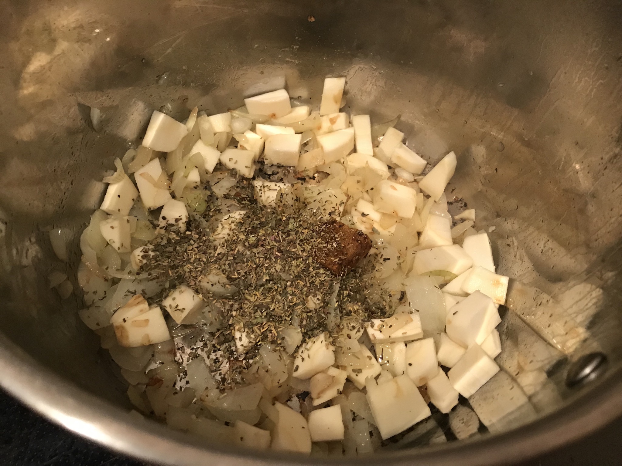 - Pelamos la chirivía/patata/calabaza o verdura elegida y las cortamos en cuadraditos de 1-2 dedos.