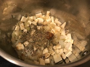 Calentamos un chorro de aceite a fuego medio en una cazuela y agregamos todas estas verduras, sal y las especias. Tapamos y dejamos cocinar unos 10 minutos, removiendo de vez en cuando.