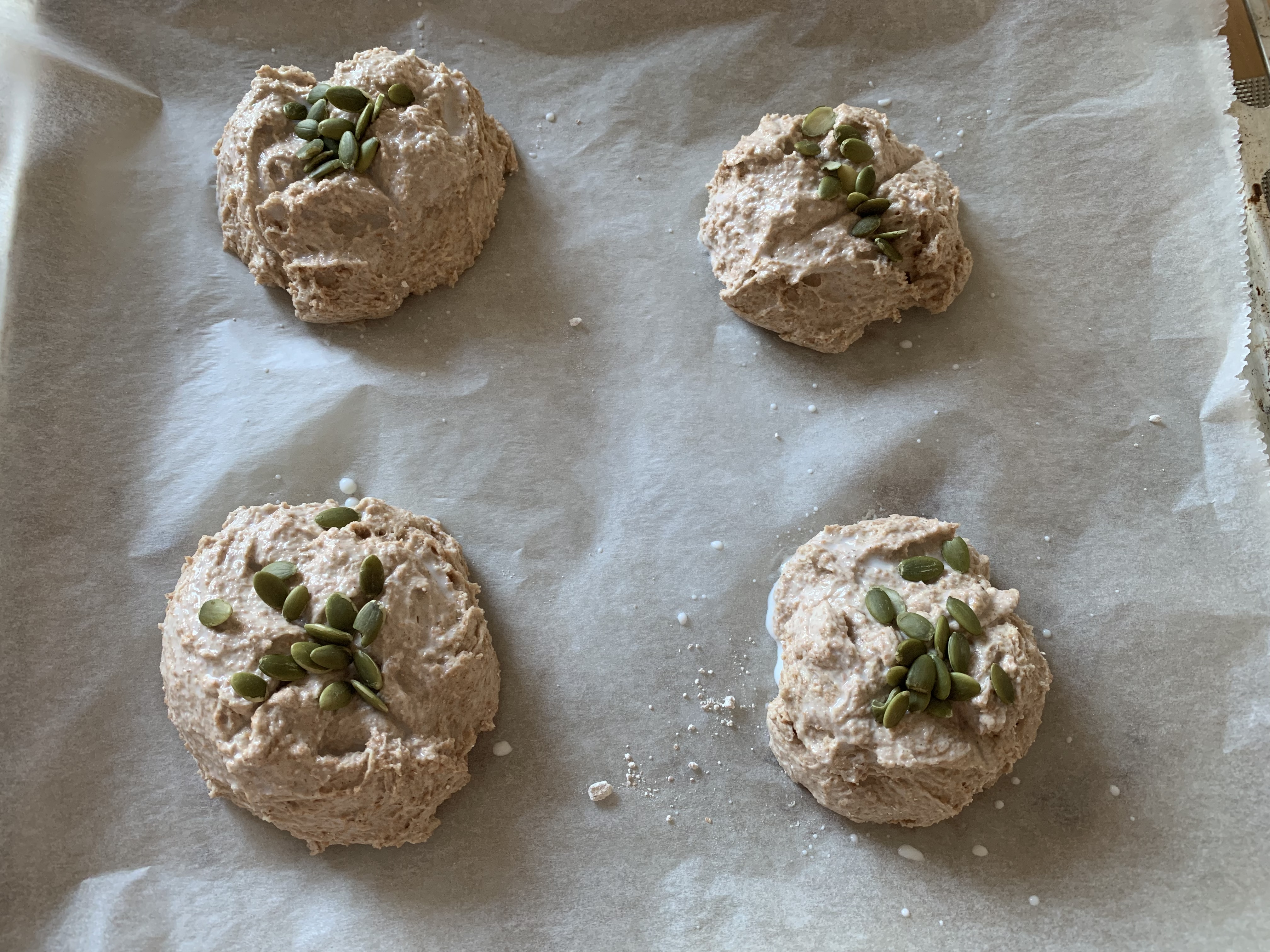Dividimos la masa en 4-6 porciones de tamaño similar. Las trabajamos un poco con las manos para darles la forma ligeramente ovalada o redonda y las ponemos sobre una bandeja de horno cubierta de papel de horno.
