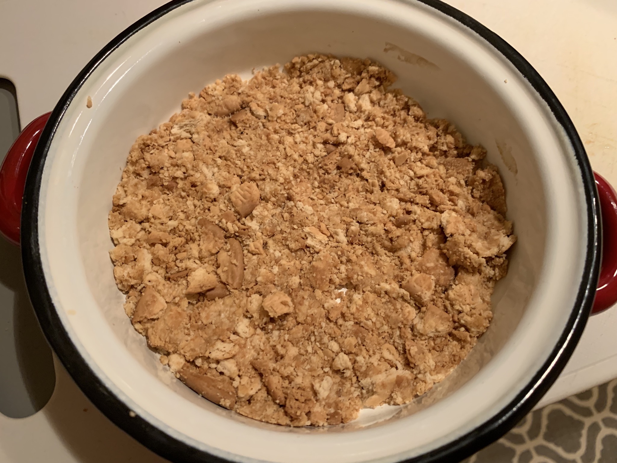 - Por otro lado, picamos bien las galletas hasta que se queden como un polvito con trozos. Esto podemos hacerlo metiéndolas en una bolsa y aplastándolas con un rodillo o bien triturándolas con la thermomix. ➡ Si prescindis de las galletas (ver listado de ingredientes), triturad ligeramente el azucar, la avena y los frutos secos con una batidora (o con el «método de la bolsa» que indicaba antes) y tostarlo todo unos minutos en una sartén.