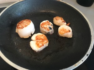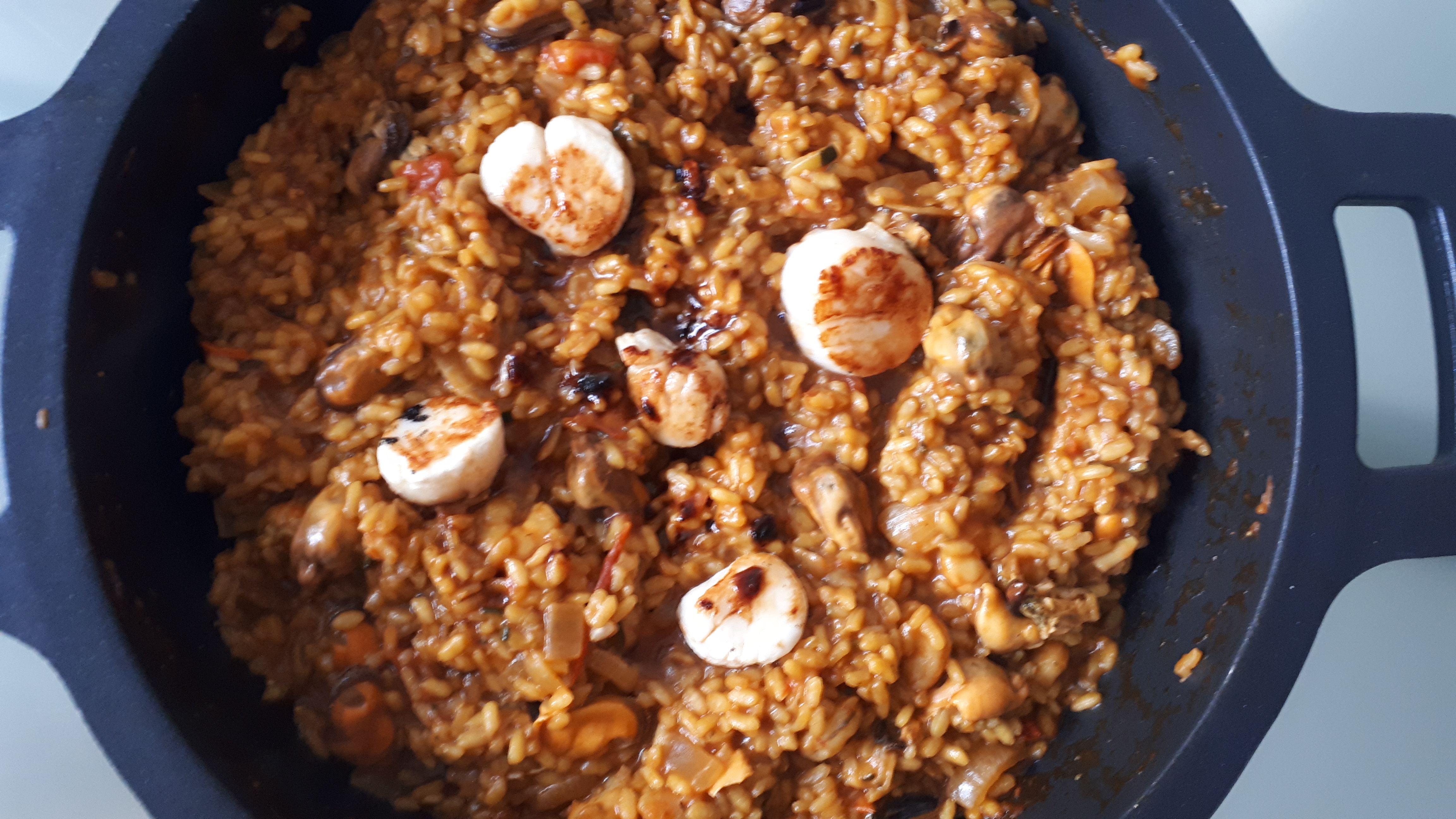 SI decidimos incluirlas, hacemos las vieiras a la plancha en una sartén con un hilillo de aceite a fuego muy fuerte, 1 minuto por cada lado. Ponemos sal gruesa si tenemos y las colocamos por encima de la paellera antes de servir.