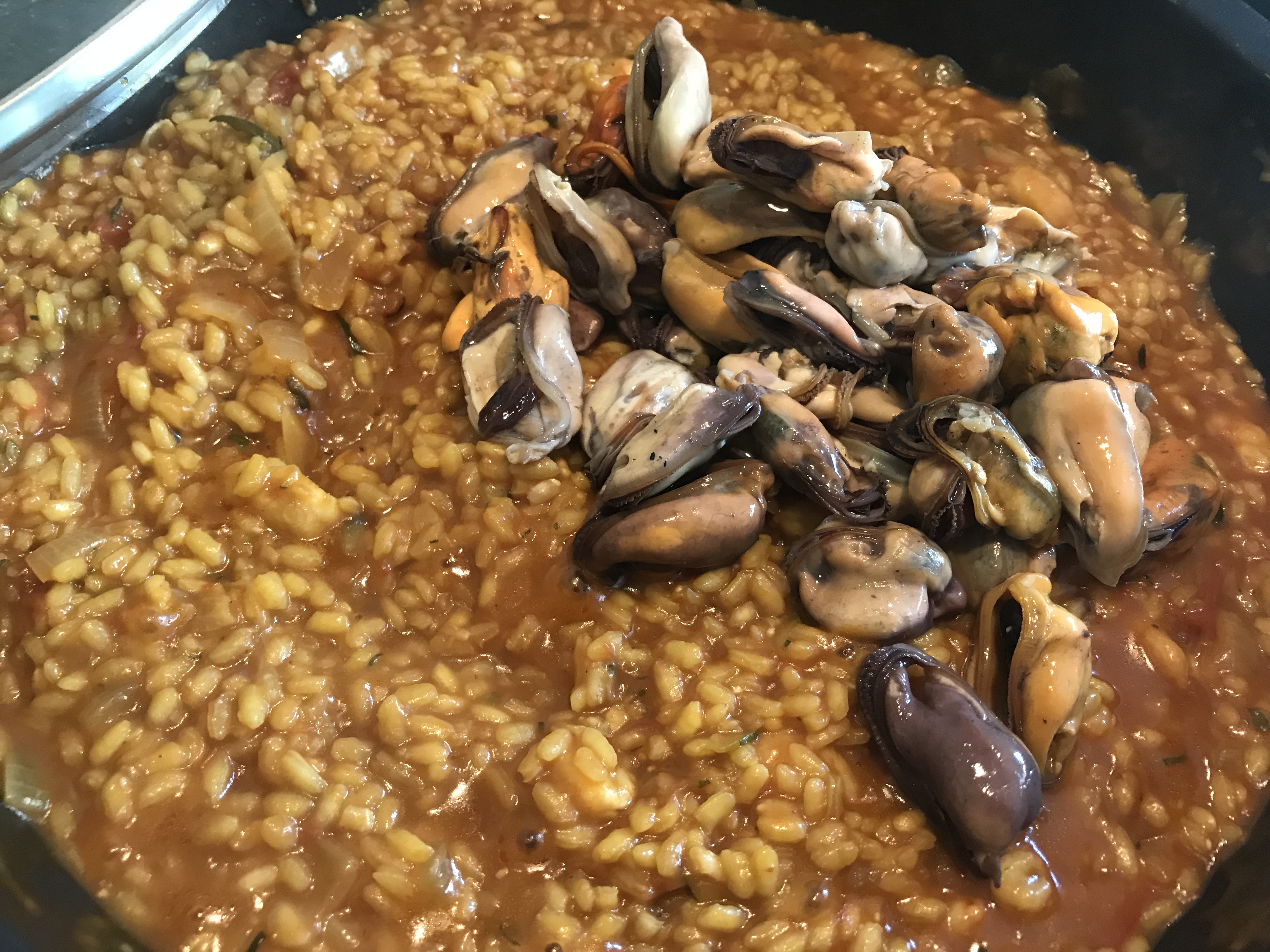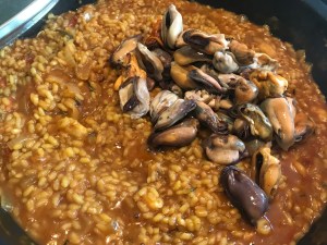 Un poquito antes de que esté listo el arroz, incorporamos los mejillones (si los hemos cocinado nosotros, les quitamos las cáscaras) y removemos.