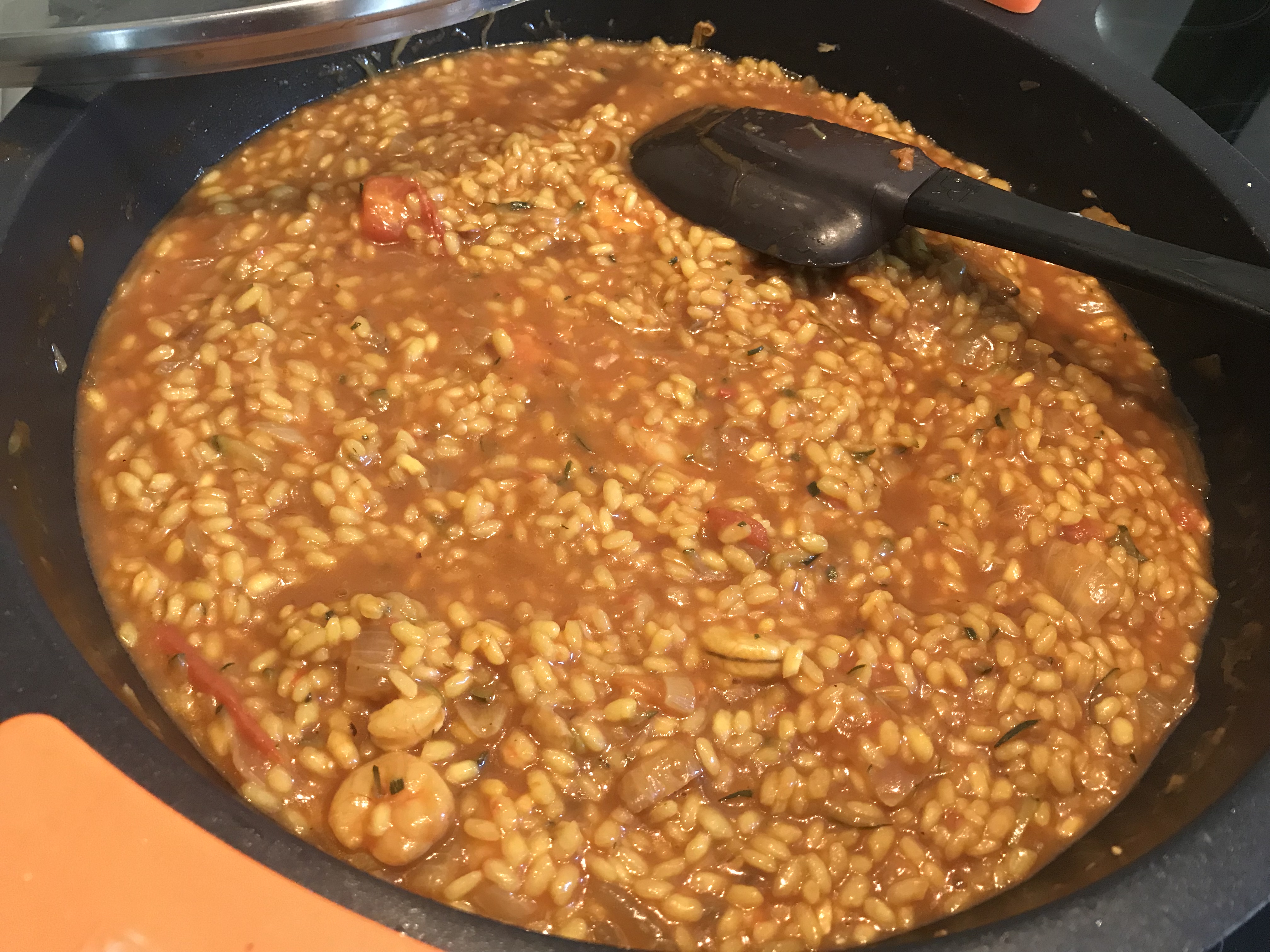 Teníamos pensado preparar paella para el sábado y, al llegar al supermercado, no quedaban ni las verduras ni el combinado de marisco que suelo ponerle… Como no soy de rendirme, pensé qué teníamos por casa y me salió este impresionante arroz que hoy os presento bautizado como «paella ciega = arroz a banda = arroz del senyoret». Los tres son nombres para denominar a lo mismo: una paella sin cáscaras. UNA BENDICIÓN, VAMOS.