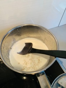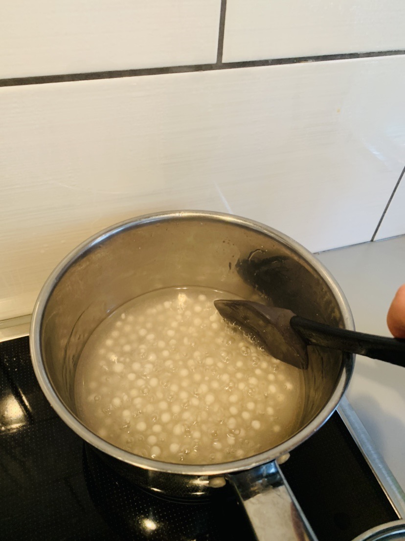 Una vez que veamos que están bastante transparentes, las escurrimos (como si estuviésemos cociendo pasta) y las volvemos a incorporar al cazo, agregando ahora la leche de coco, la “normal” y el azúcar.